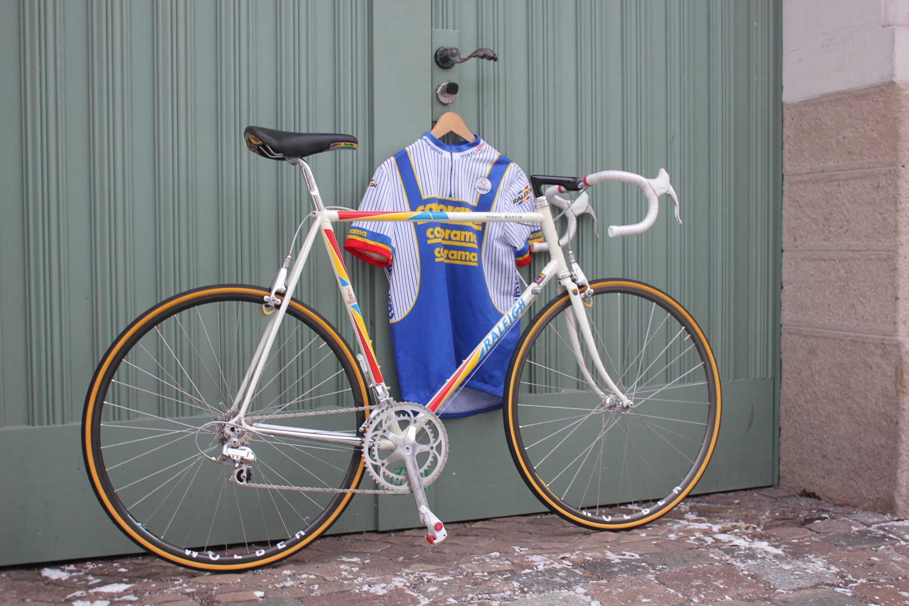 The bike presented here is a small mystery. The frame was built for Robert Martin, yet Robert Martin does not appear in any official team lists from those years. One might think that Robert Martin's name was simply applied as a decal on the top tube—but that is not the case. Both the frame and fork clearly show his initials. The build also features a few peculiarities: the then rather rare C-Record crankset is fitted in 180 mm length, and instead of the standard C-Record shifters, Simplex Retrofriction components were used. The geometry of the frame also suggests a custom-made frame for the team. Anyone with additional information is welcome to contact me.