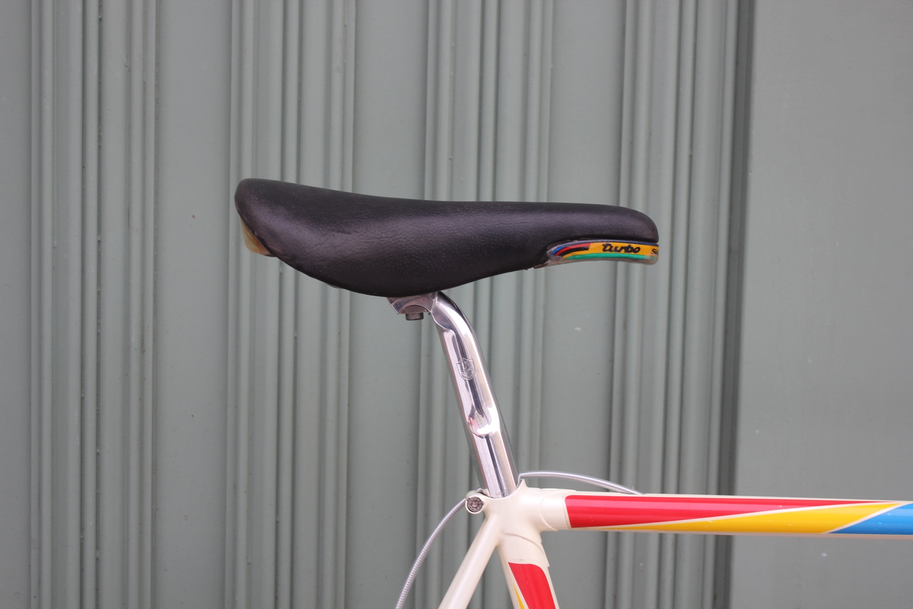 The bike is equipped with an almost complete Campagnolo C-Record group, including the legendary Delta brakes. These brakes stand, like few other components, for Campagnolo's technical ambition and design boldness of the era. Their distinctive design language, combined with high-quality mechanics, makes them an iconic element of the late 1980s and early 1990s. Combined with the C-Record group, the bike presents a coherent overall impression of elegance, functionality, and technical sophistication, representing the state of the art in professional cycling at the time.