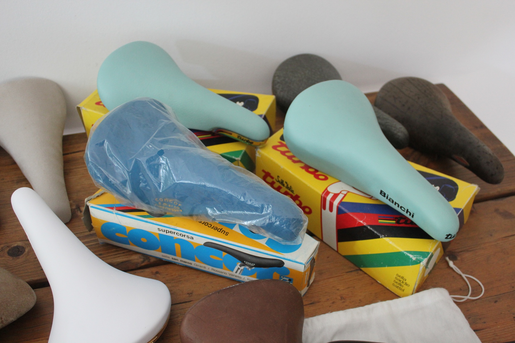 Neben den originalen und restaurierten Rennradsätteln habe ich auch neu aufgelegte Klassiker von Selle San Marco im Sortiment – darunter die legendären Modelle Rolls, Concor und Regal, die glücklicherweise wieder produziert werden.