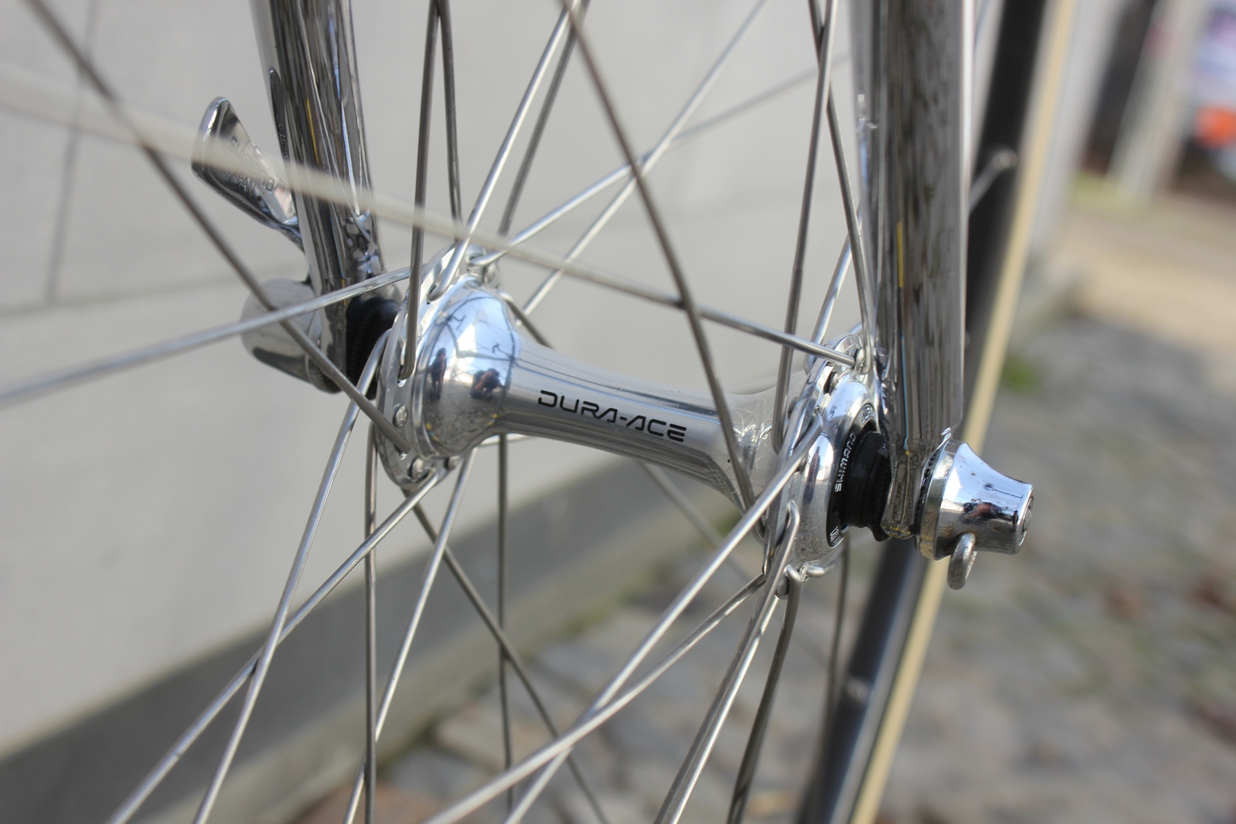 Aufgebaut ist der Rahmen mit einer kompletten Shimano Dura-Ace-Gruppe. Die 7400er-Baureihe hat Shimano nicht umsonst über einen sehr langen Zeitraum produziert – diese Gruppe schaltet auch nach über 30 Jahren noch perfekt. Das Rad ist insgesamt in einem sehr guten Zustand, der Laufradsatz ist quasi unbenutzt. Das Rad wurde selbstverständlich komplett gewartet und perfekt eingestellt.