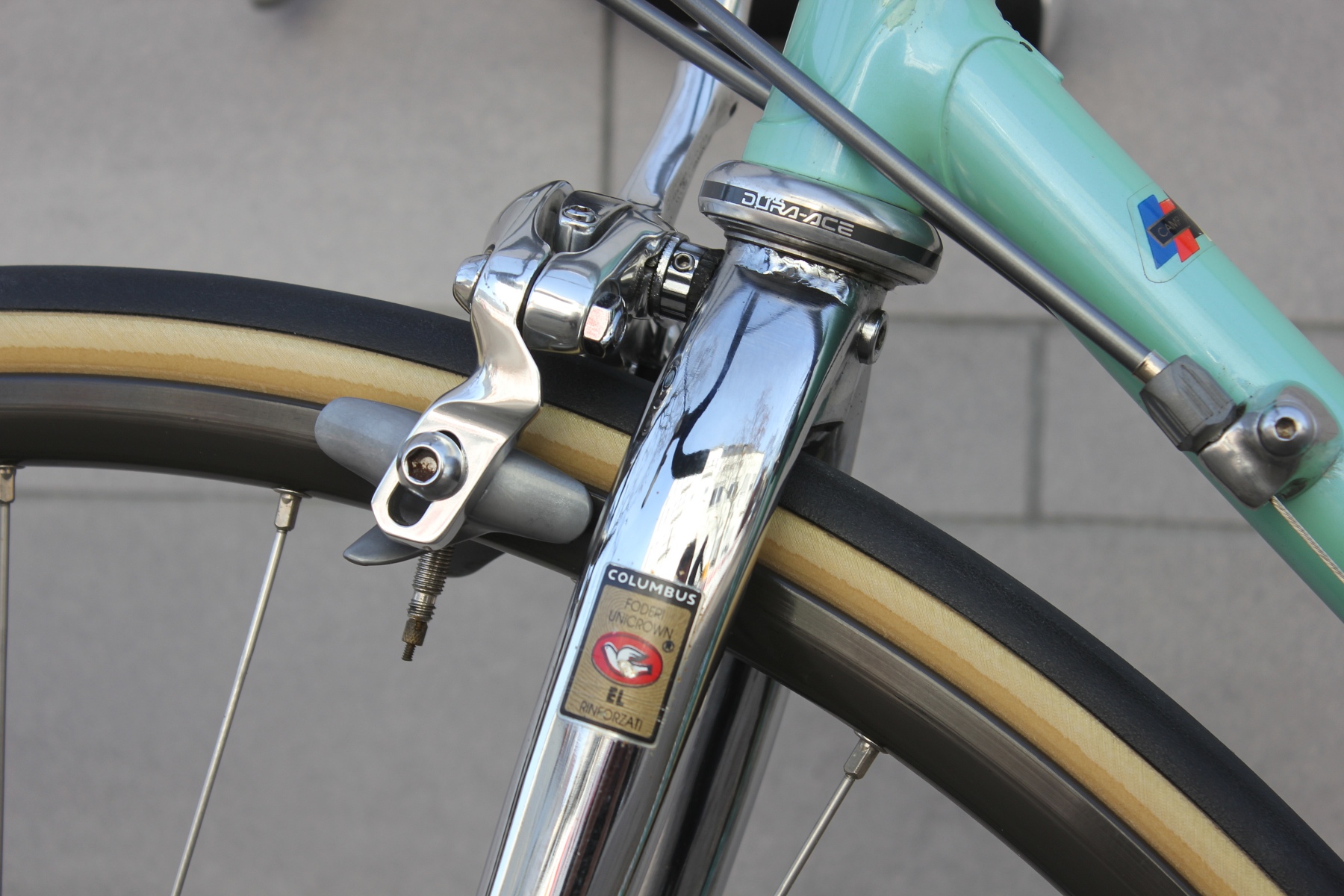 Das hier vorgestellte Bianchi Reparto Corse aus extra leichten Columbus TSX-Rohren aus den frühen Neunzigern ist in einem tollen Zustand. Für mich zählen diese Bianchi-Rahmen zu den letzten „vernünftigen" Stahlrahmen, die bei Bianchi gebaut wurden. Der Columbus-TSX-Rohrsatz hat hervorragende Fahreigenschaften und ist eine Weiterentwicklung des berühmten SLX. Der fein gemuffte Rahmen mit der eleganten Zugverlegung im Oberrohr gehört gleichzeitig zu einer der letzten Generationen aus der berühmten Reparto Corse-Rahmenbauabteilung für Rennmaschinen bei Bianchi. Besonders zu erwähnen sind die aerodynamischen Sitzstreben, die der Rahmen noch von den X4-Modellen übernommen hat. Auch hier findet man die typische Bianchi-Gravur in der Brücke der Befestigung für die Hinterradbremse und auf der Tretlagermuffe.