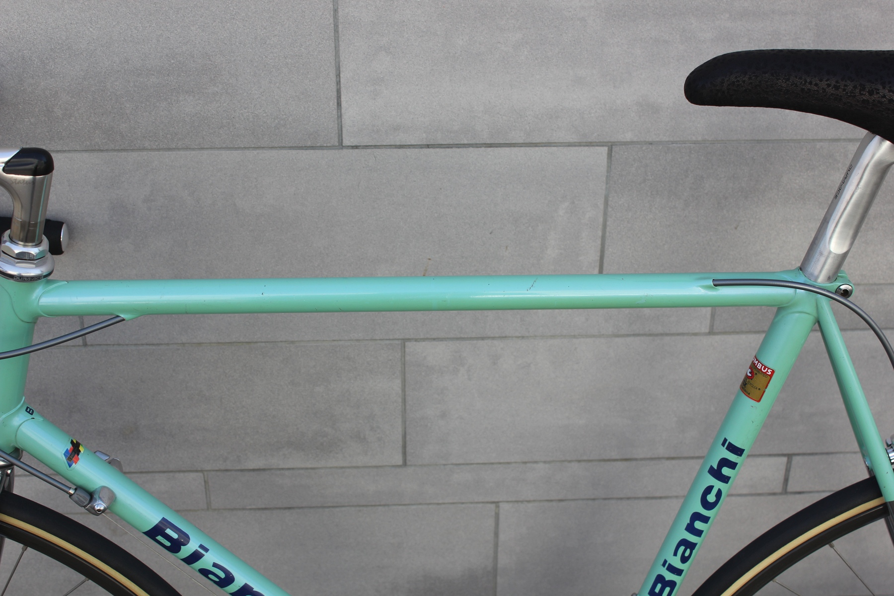 The Bianchi Reparto Corse presented here, built from extra-light Columbus TSX tubing, dates from the early 1990s and is in excellent condition. For many enthusiasts, these Bianchi frames represent the last of the truly "sensible" steel racing frames produced by the brand. The Columbus TSX tubeset offers outstanding ride characteristics and is an evolution of the renowned SLX. The beautifully lugged frame with its elegant internal cable routing through the top tube belongs to one of the final generations built in Bianchi's famous Reparto Corse workshop – the department responsible for their professional racing machines.