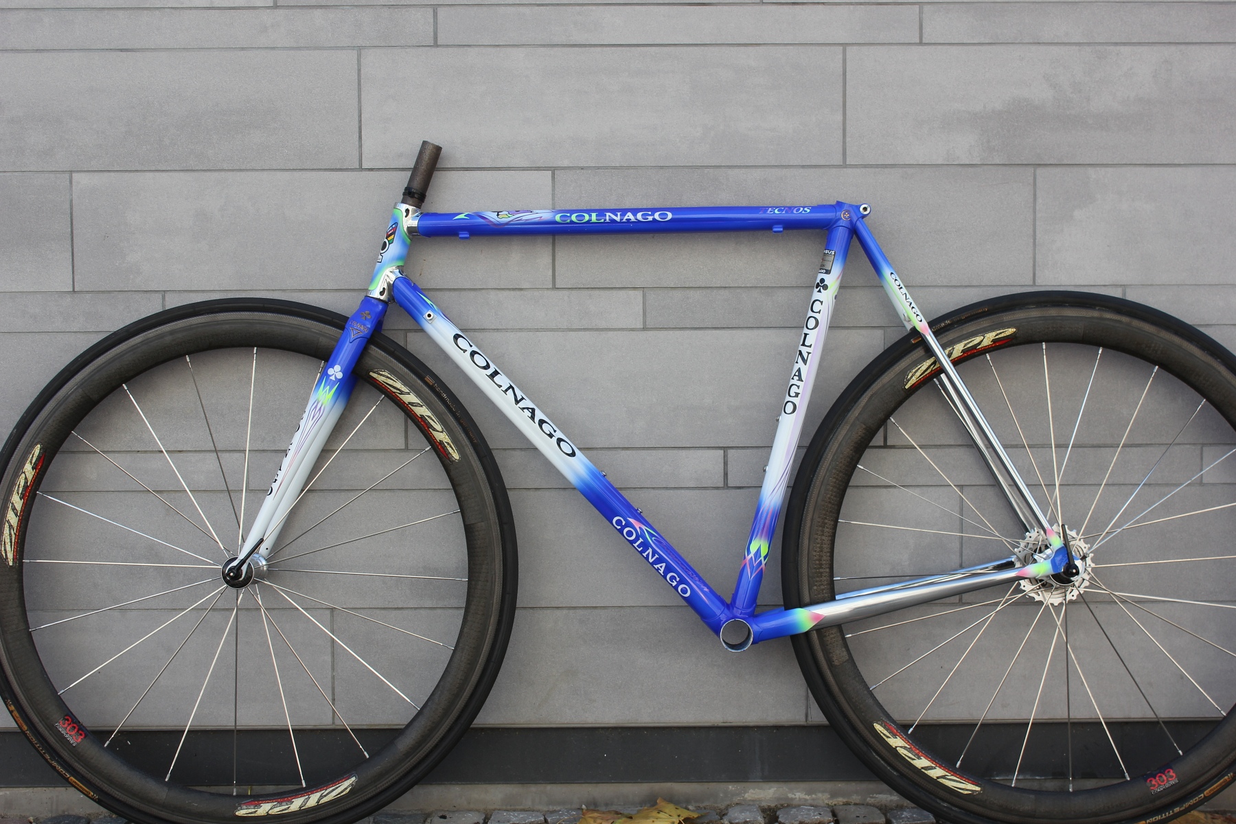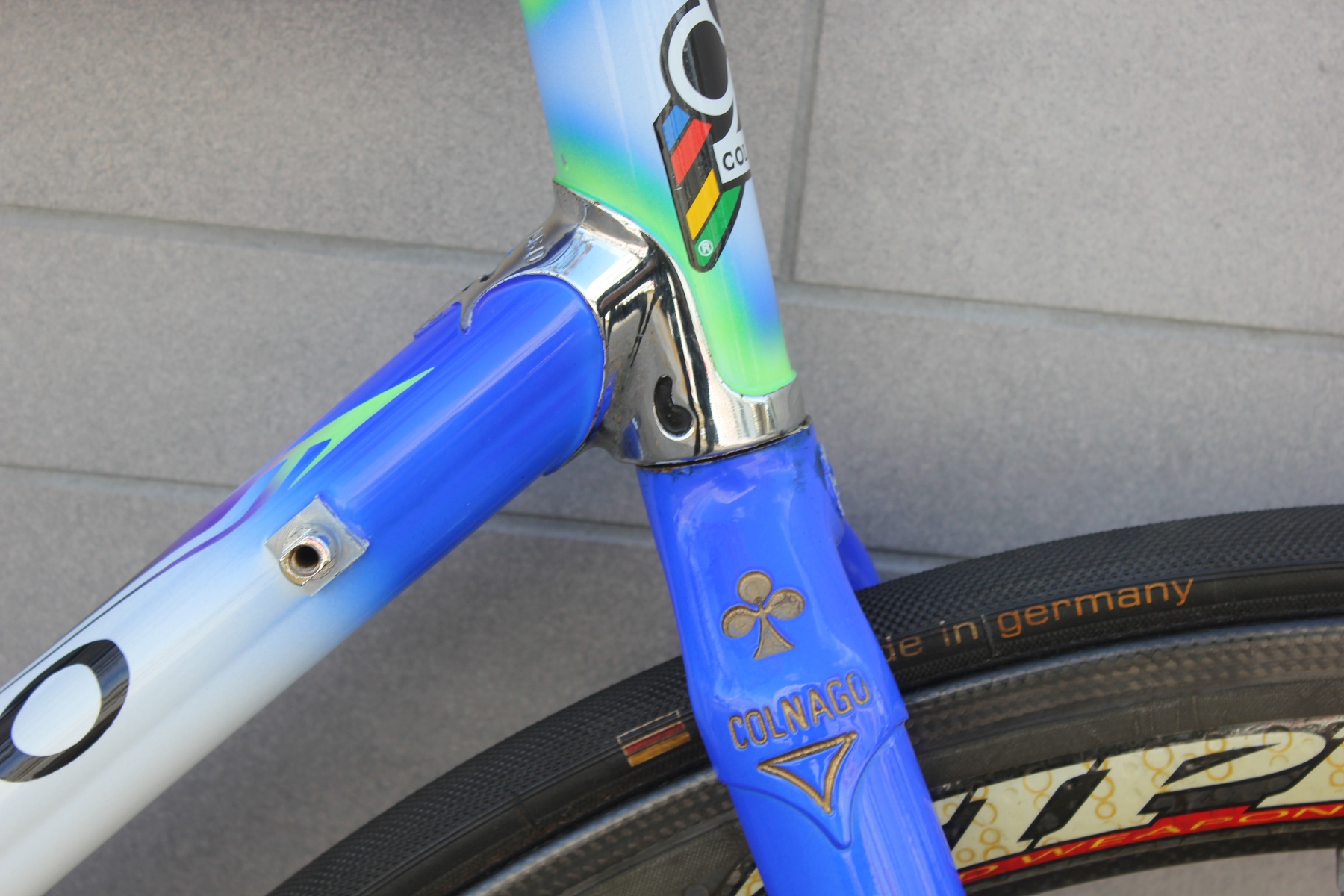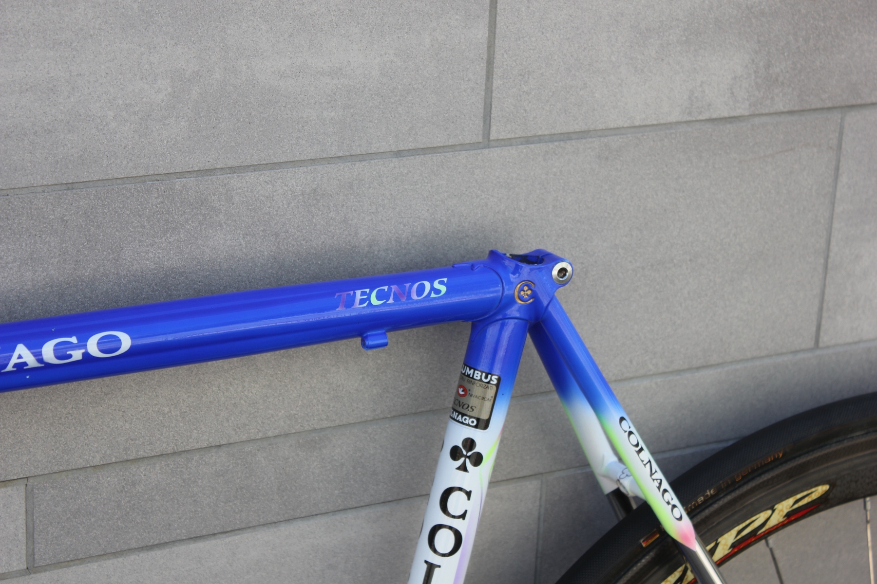 Das hier vorgestellte Tecnos-Rad ist der beste und leichteste Stahlrahmen, den Colnago je für den Profibereich entwickelt hat. Er wurde von 1995 bis 2000 gebaut und vertrieben. Der hervorragende Rahmen besteht aus eigens von Columbus für Colnago entwickelten Nivachrom-Stahlrohren mit überdimensionalen Ober- und Unterrohren, die eine fünfseitige Kleeblattform aufweisen. Verchromte Dreipunkt-Spezialmuffen am Steuerrohr und an der Precisa-Stahlgabel machen dieses Set zu einem echten Highlight.