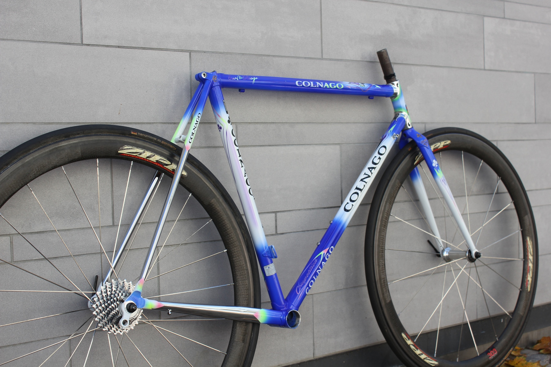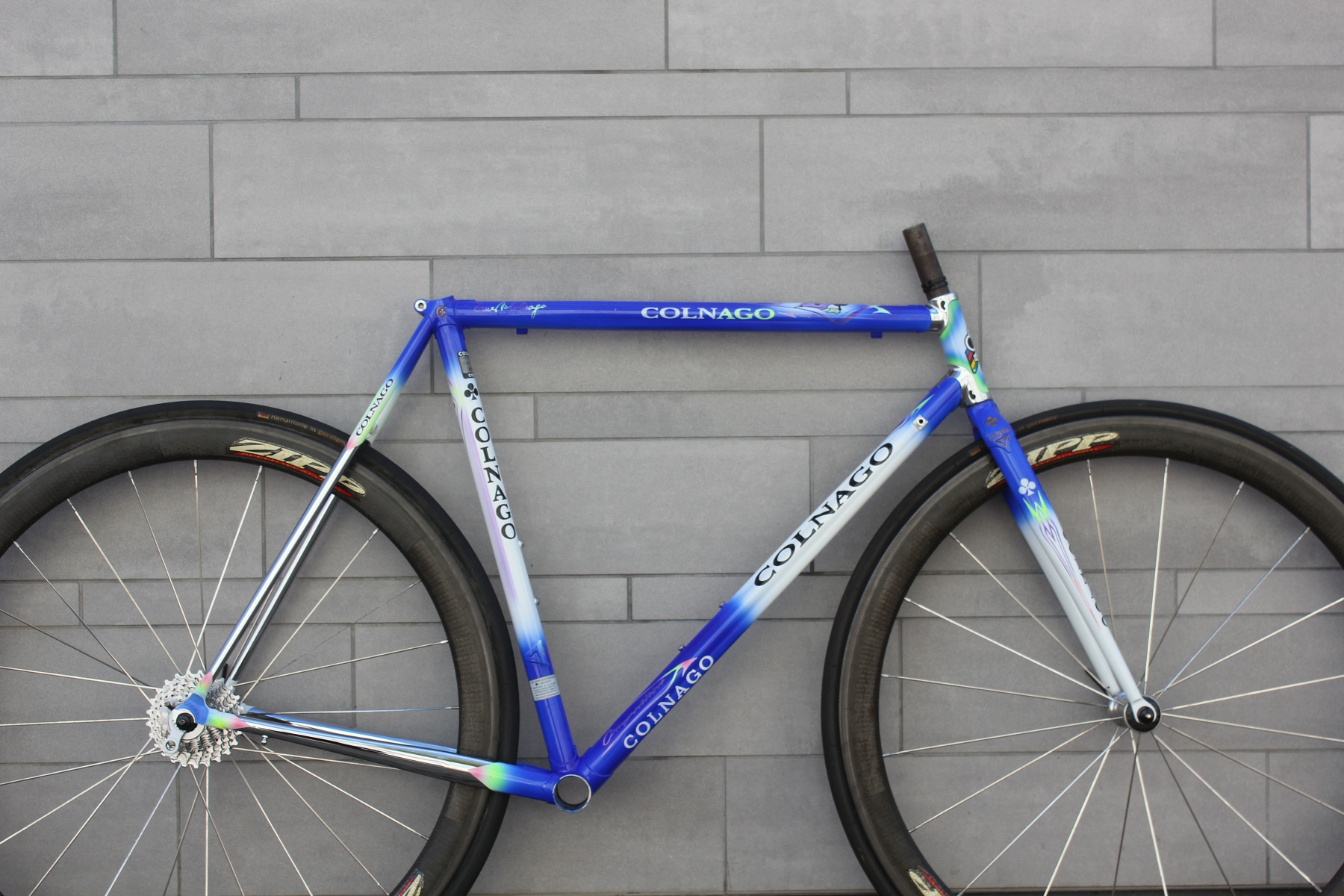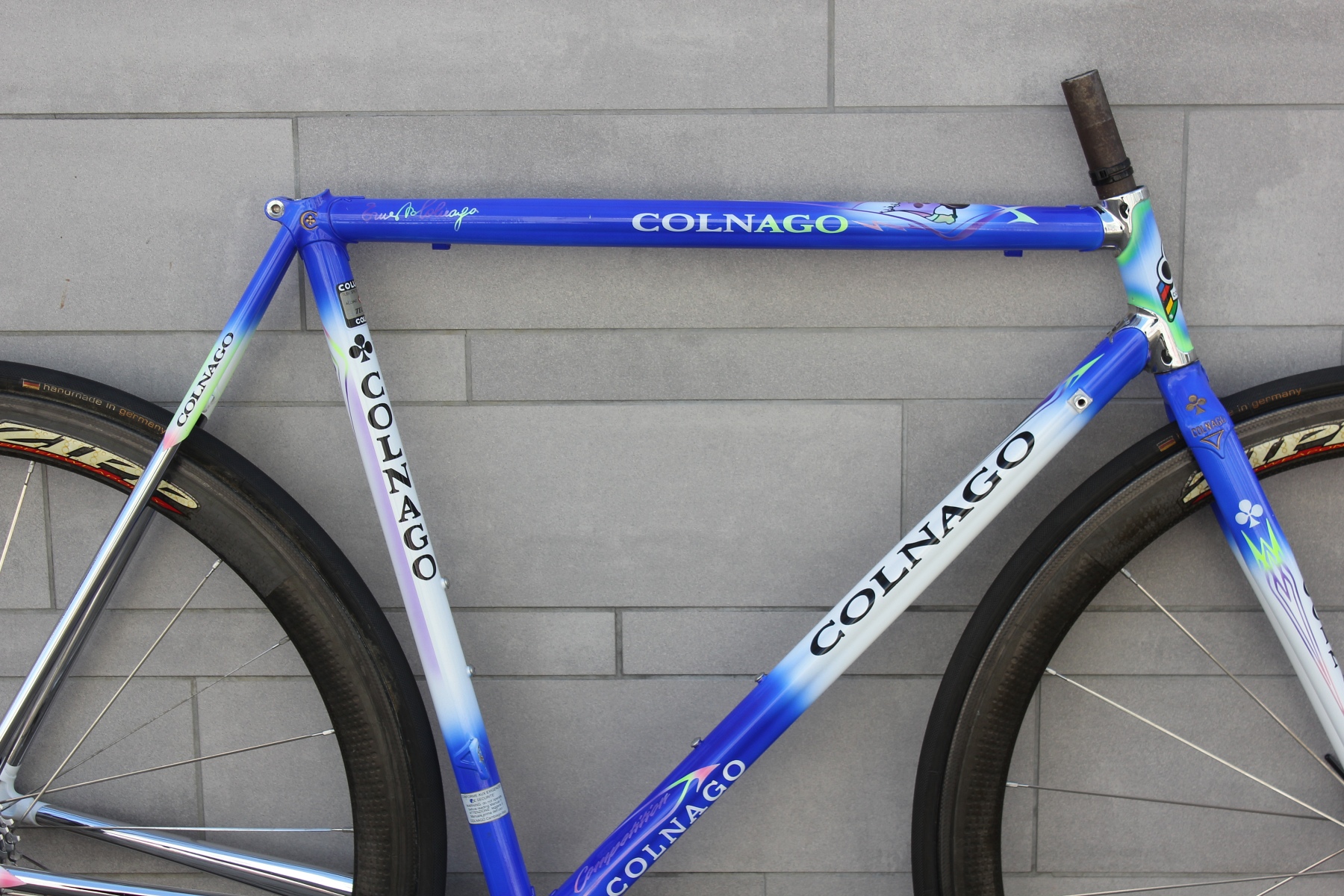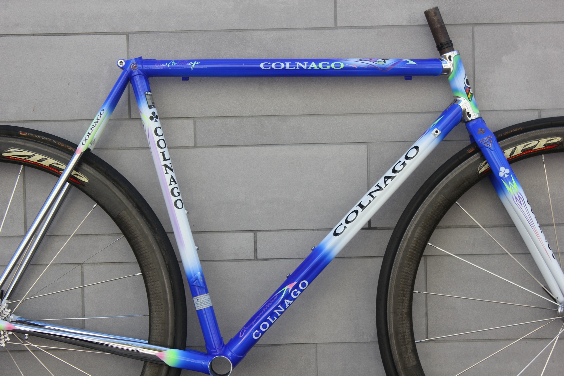 Das hier vorgestellte Tecnos-Rad ist der beste und leichteste Stahlrahmen, den Colnago je für den Profibereich entwickelt hat. Er wurde von 1995 bis 2000 gebaut und vertrieben. Der hervorragende Rahmen besteht aus eigens von Columbus für Colnago entwickelten Nivachrom-Stahlrohren mit überdimensionalen Ober- und Unterrohren, die eine fünfseitige Kleeblattform aufweisen. Verchromte Dreipunkt-Spezialmuffen am Steuerrohr und an der Precisa-Stahlgabel machen dieses Set zu einem echten Highlight.