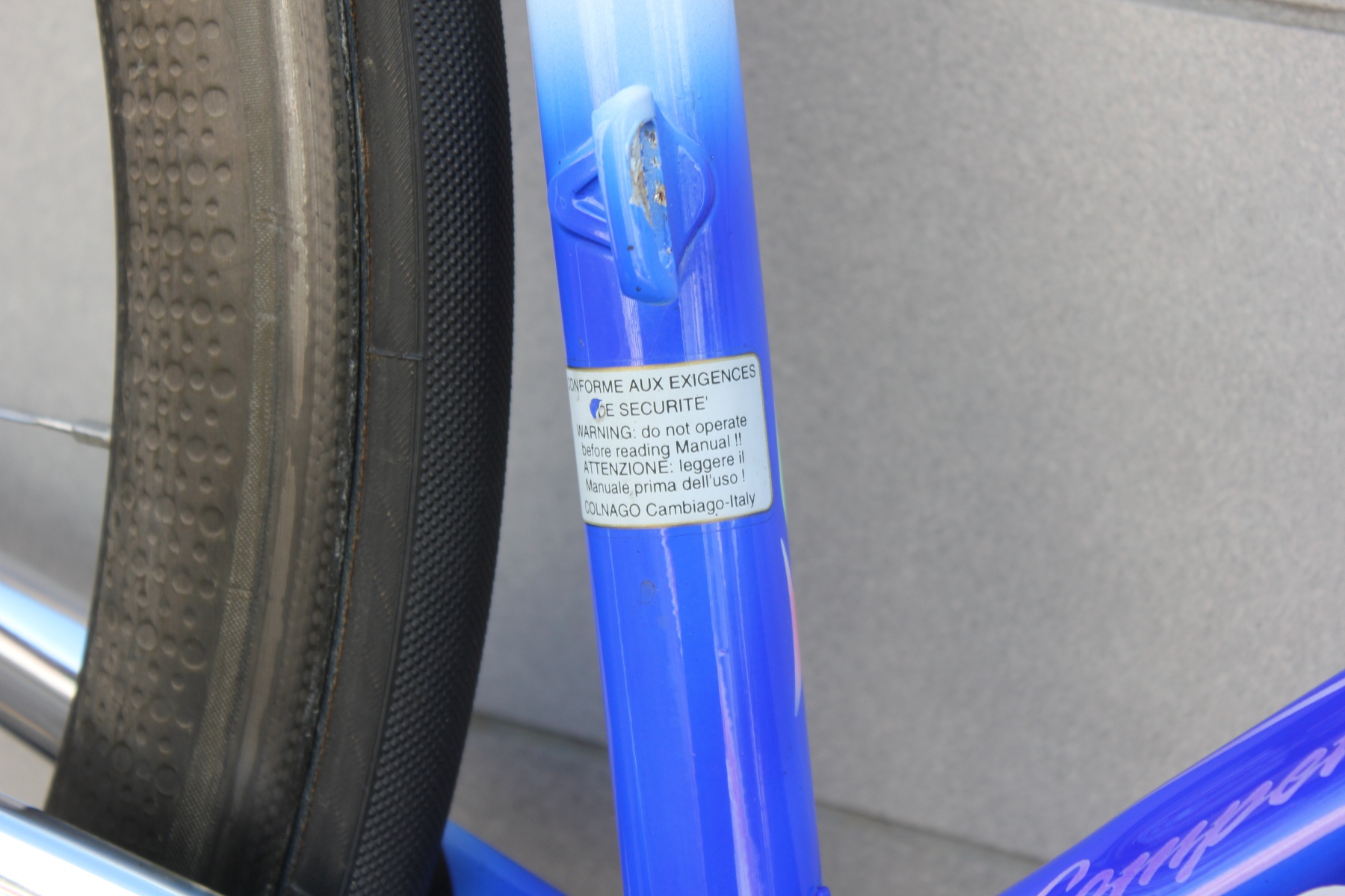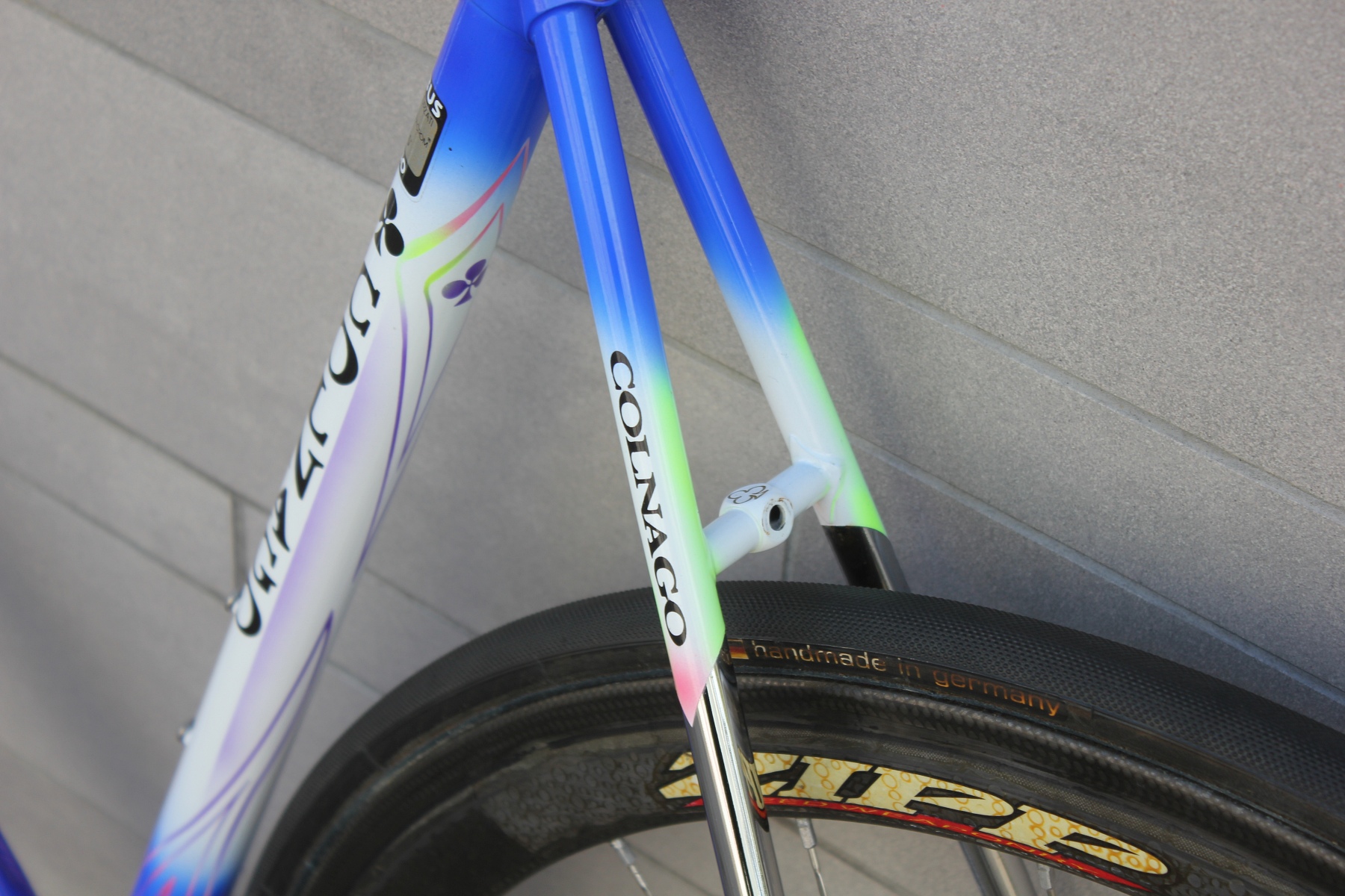 The Tecnos presented here is the finest and lightest steel frame Colnago ever developed for professional use. It was produced and sold between 1995 and 2000. The outstanding frame is made from specially developed Nivachrom steel tubing by Columbus, featuring oversized top and down tubes with Colnago's signature five-leaf clover cross-section. Chrome-plated triple-point lugs at the head tube and the Precisa steel fork make this set a true highlight.