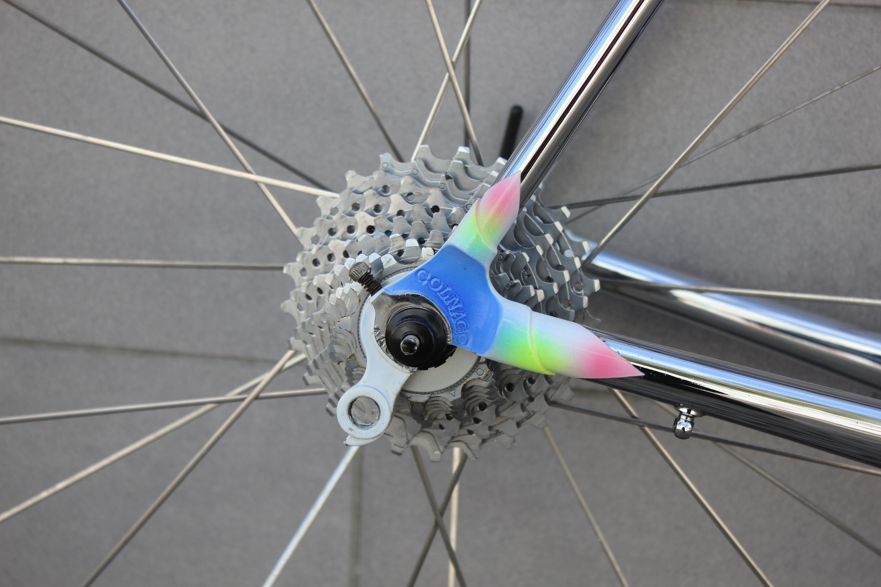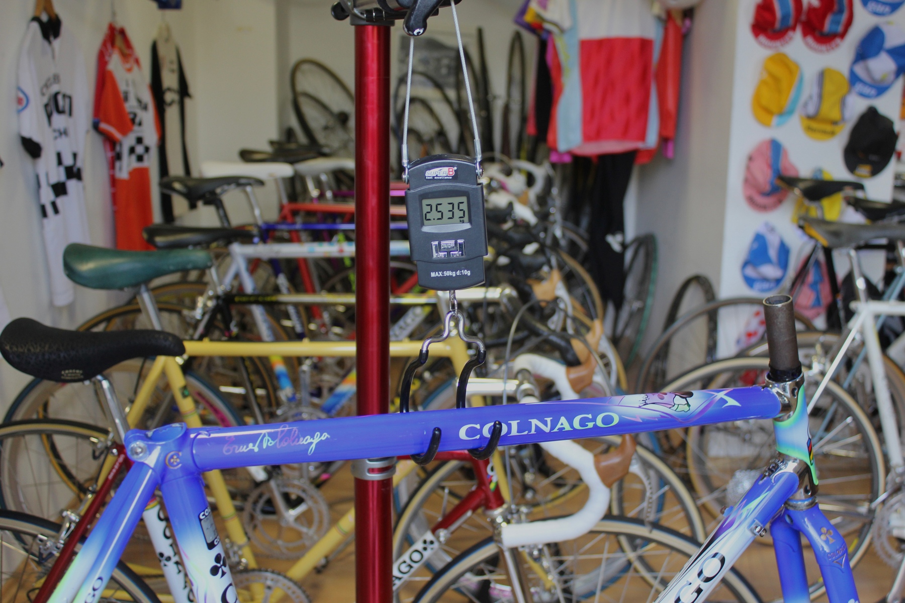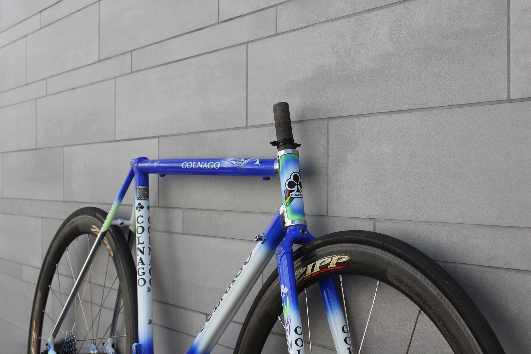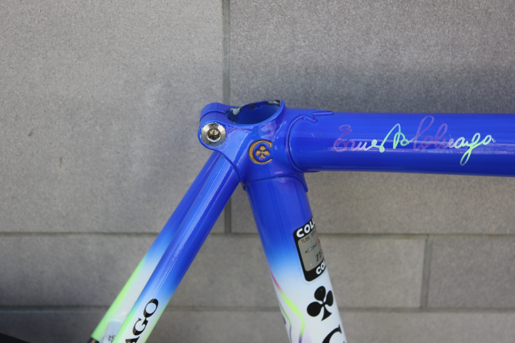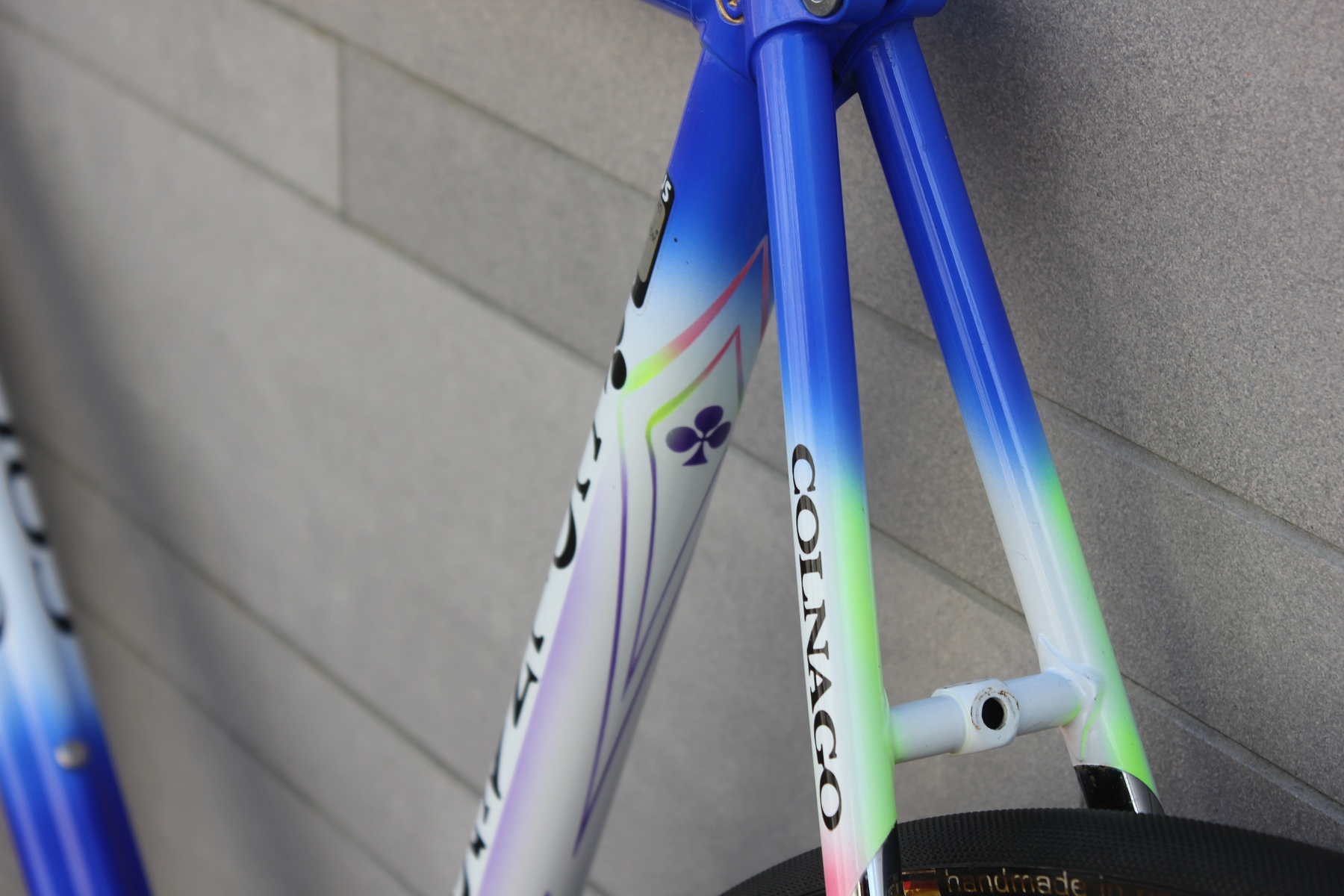 Das hier vorgestellte Tecnos-Rad ist der beste und leichteste Stahlrahmen, den Colnago je für den Profibereich entwickelt hat. Er wurde von 1995 bis 2000 gebaut und vertrieben. Der hervorragende Rahmen besteht aus eigens von Columbus für Colnago entwickelten Nivachrom-Stahlrohren mit überdimensionalen Ober- und Unterrohren, die eine fünfseitige Kleeblattform aufweisen. Verchromte Dreipunkt-Spezialmuffen am Steuerrohr und an der Precisa-Stahlgabel machen dieses Set zu einem echten Highlight.