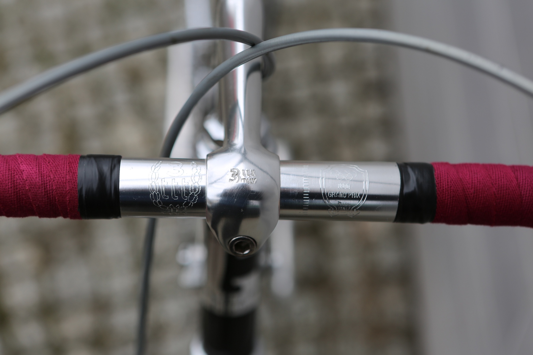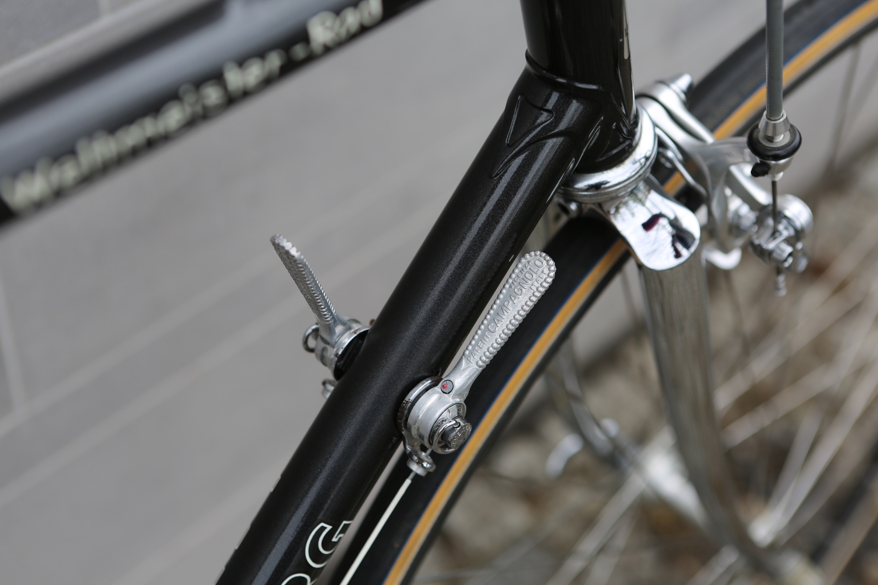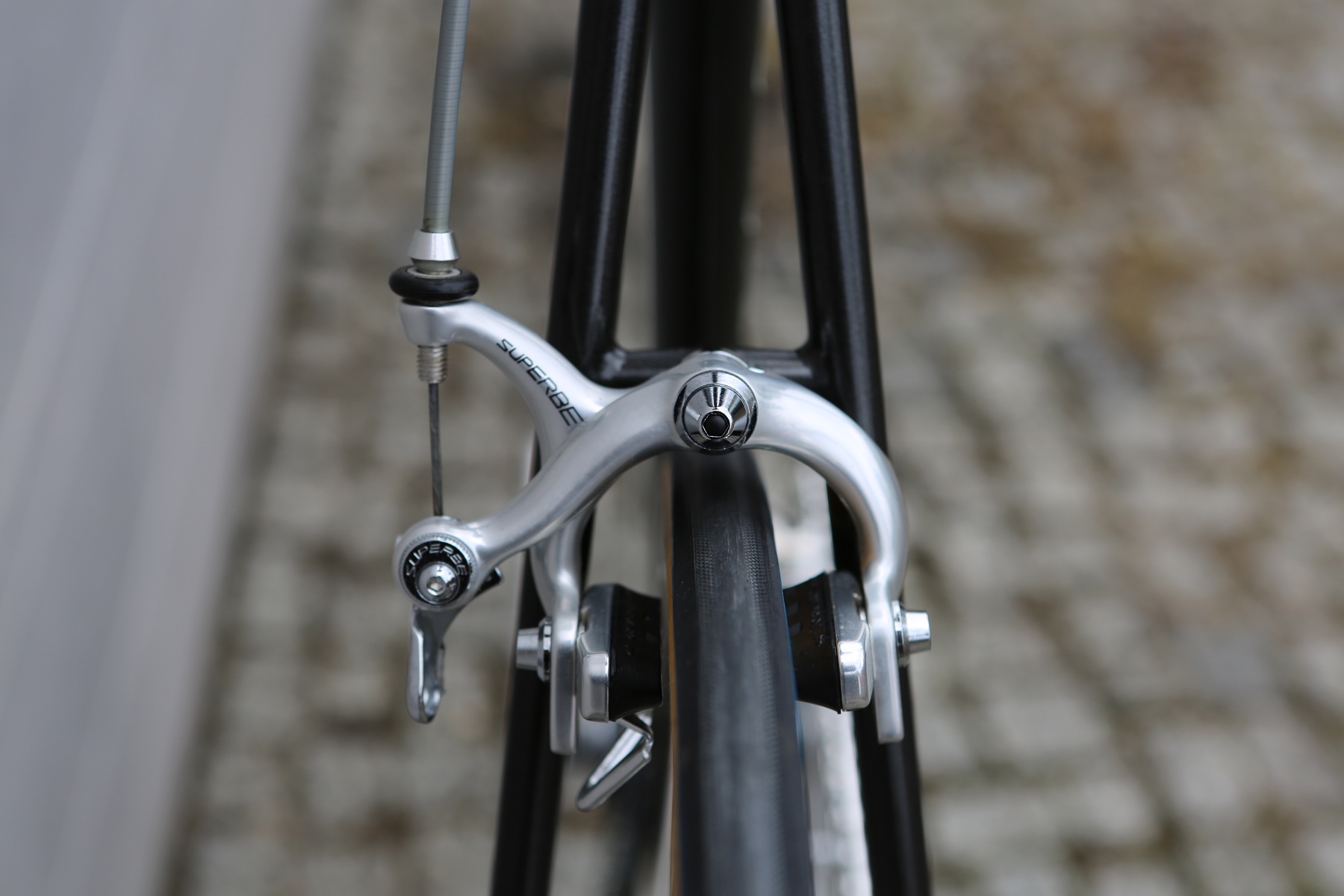 Ebenso konsequent wie beim Rahmen war die Auswahl der Komponenten. Statt auf strikte Markenreinheit zu achten, verfolgte man eine klare Philosophie: Es wurde verbaut, was technisch jeweils zur Spitze gehörte. Die Schaltungskomponenten stammen von Campagnolo in Form der Novo Record Gruppe, bekannt für ihre Präzision und Langlebigkeit. Die Bremsanlage ist eine Superbe Pro von SunTour, geschätzt für ihre feine Dosierbarkeit. Kurbel, Innenlager und Naben wurden aus dem Hause Shimano gewählt, konkret aus der Dura-Ace-Serie, die für technische Perfektion stand.