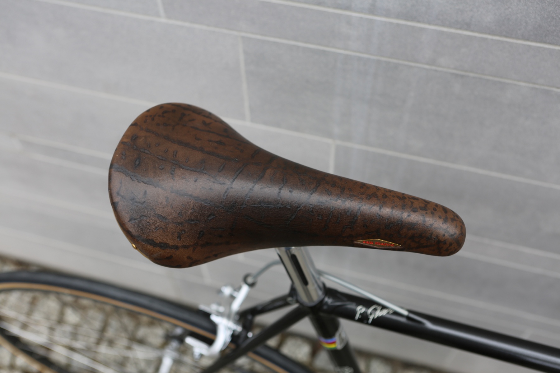 The selection of components was just as consistent as the work on the frame. Rather than adhering to strict brand purity, a clear philosophy was followed: only what represented the technical pinnacle at the time was installed. The shifting components come from Campagnolo in the form of the Novo Record group, known for its precision and durability. The braking system is a Superbe Pro from SunTour, appreciated for its fine modulation. Crankset, bottom bracket, and hubs were chosen from Shimano—specifically from the Dura-Ace series, which stood for technical perfection.