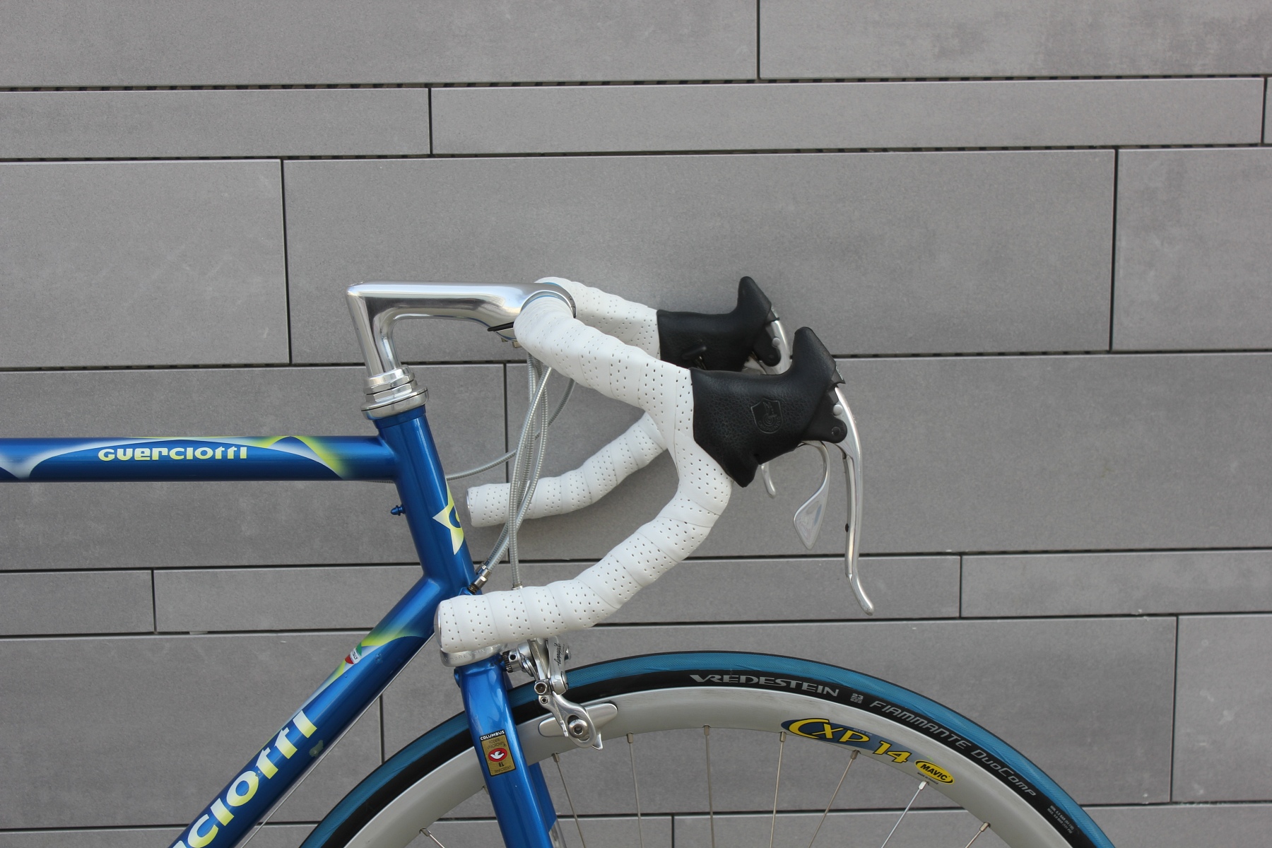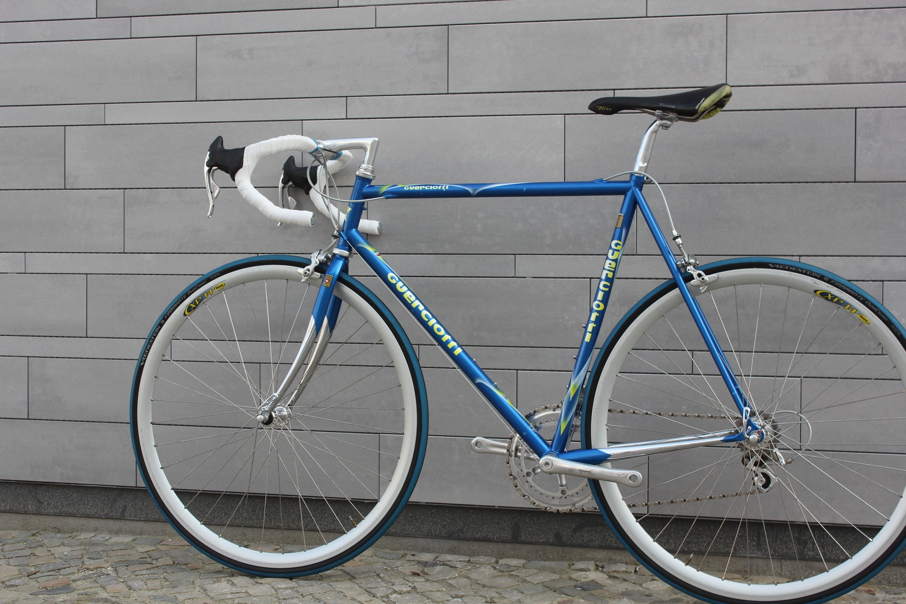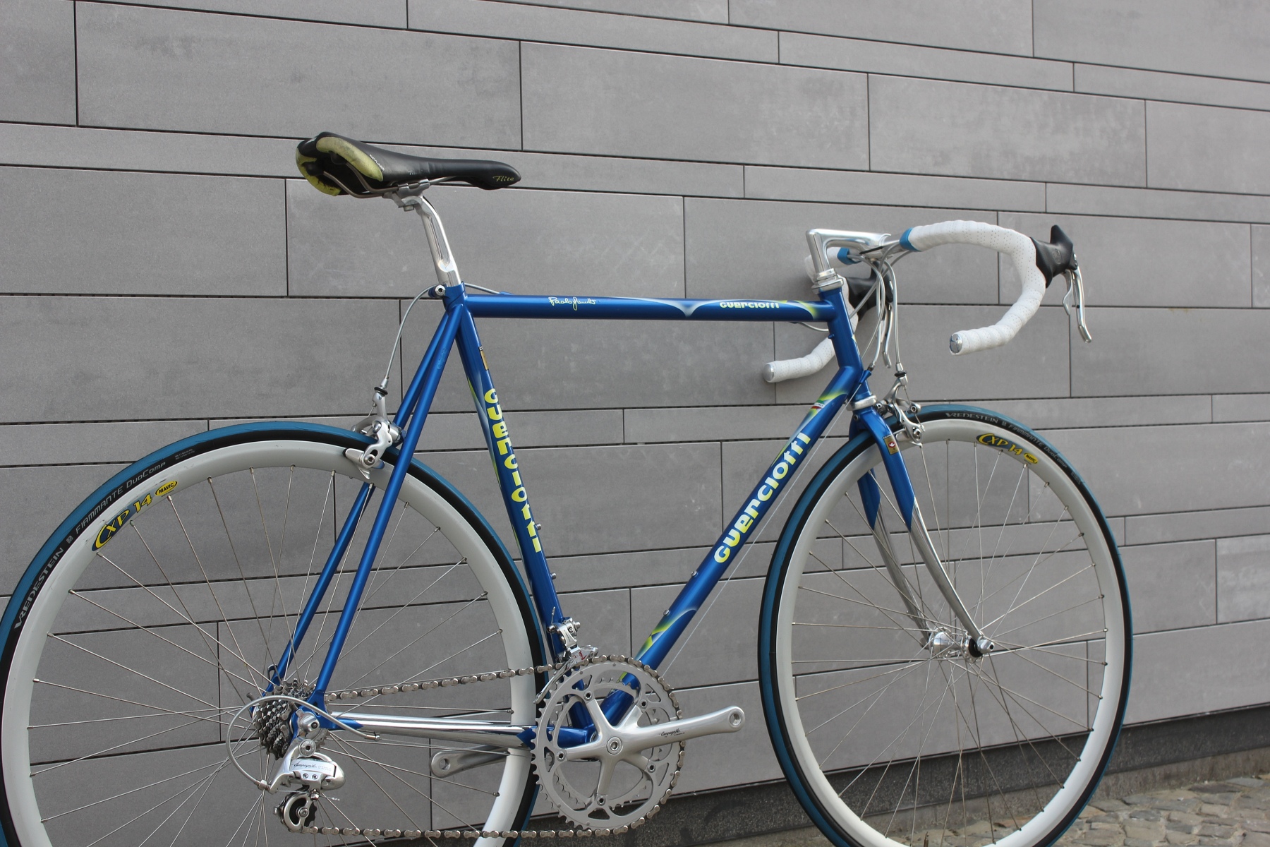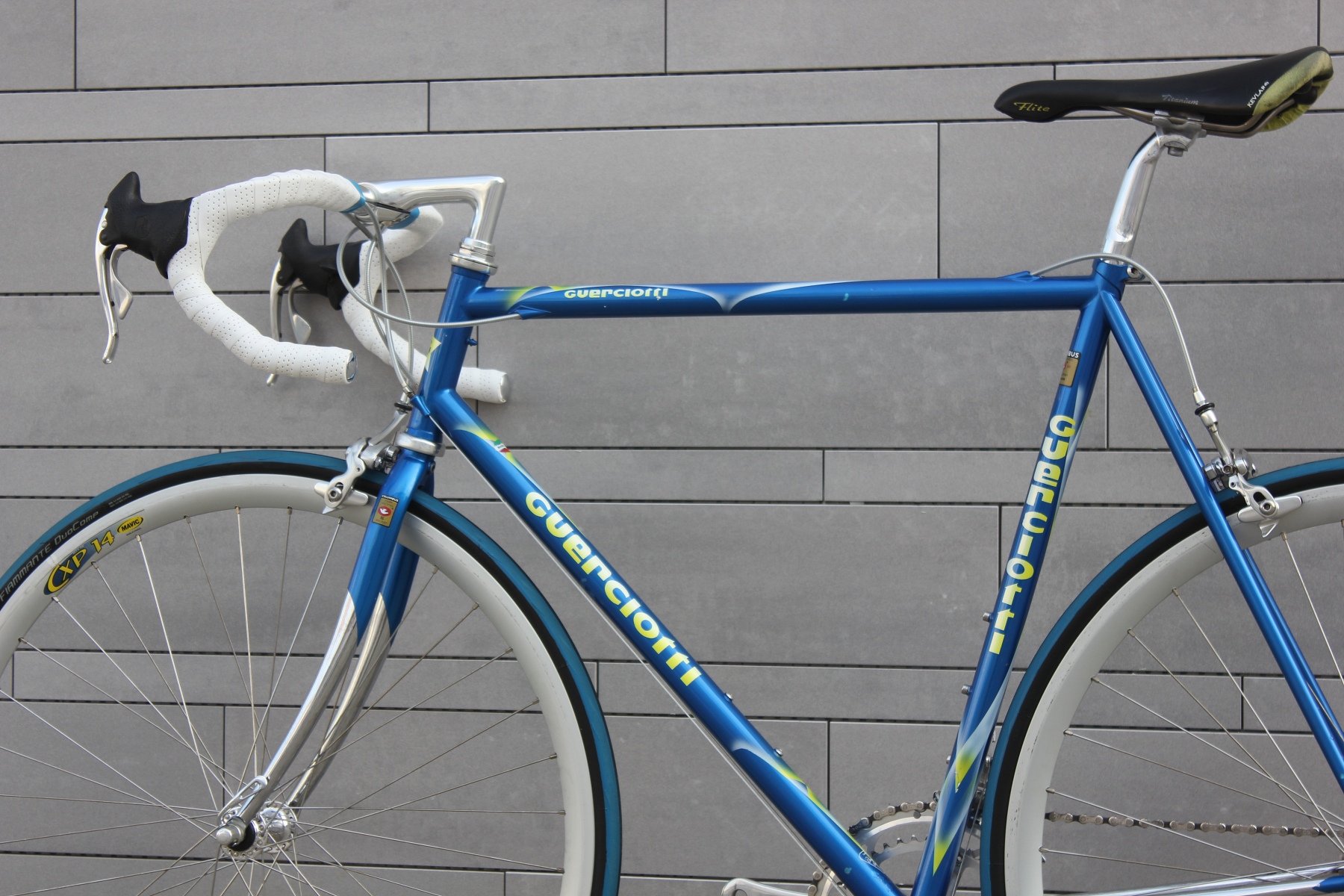 Das hier vorgestellte Guerciotti ist einer der letzten im Hause gefertigten Stahlrahmen aus den späten neunziger Jahren. Gefertigt aus extra leichten Columbus EL Rohren, mit eleganter Zugverlegung um das Steuerrohr und vielen schönen kleinen Details. Sämtliche Rohrformen sind angepasst, die Kettenstreben fast kantig ausgeführt, um optimale Steifigkeit in den Rahmen zu bringen. Lackiert wurde der Rahmen bei Carlo Dossena in Italien. Dossena Lackierungen stehen immer für etwas Besonderes, für Liebe zum Detail und für eine gewisse italienische Extravaganz.