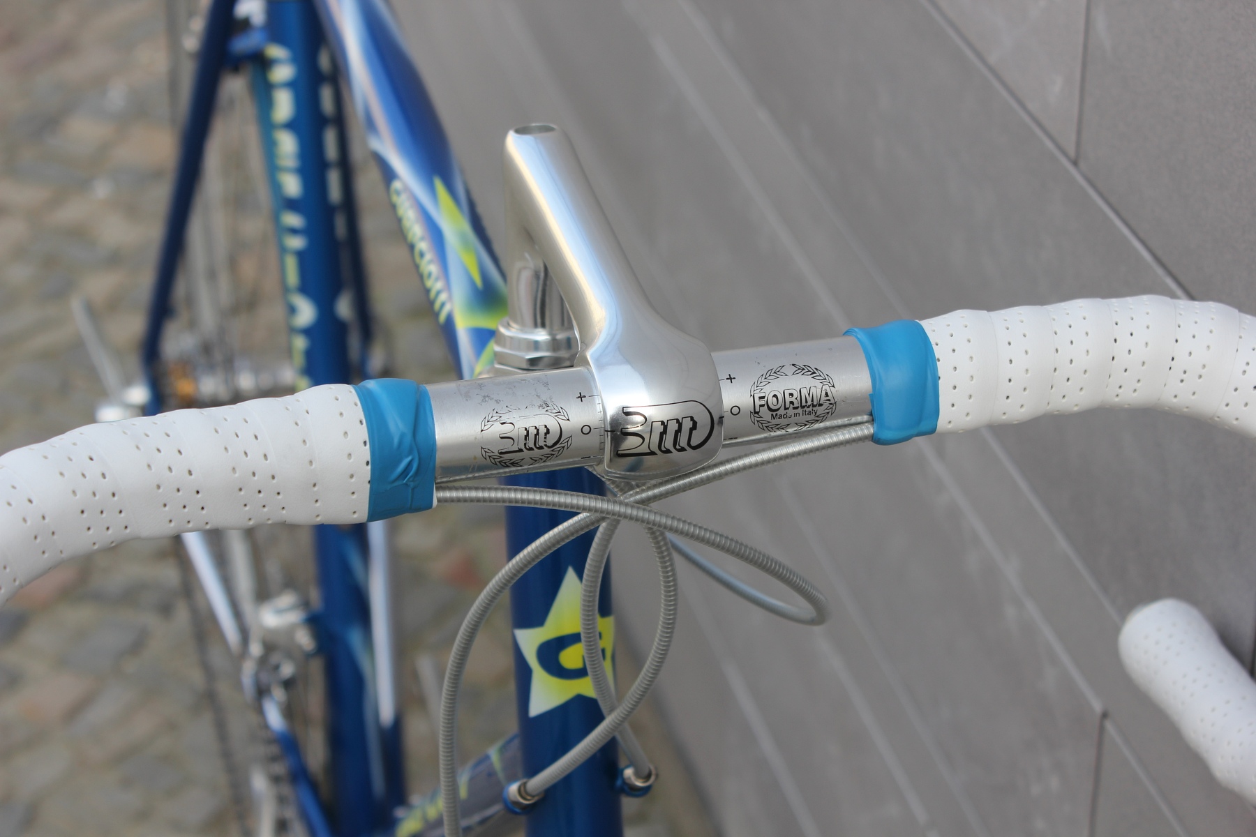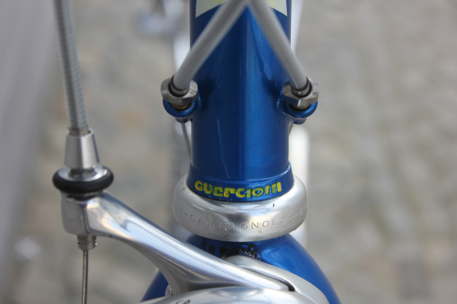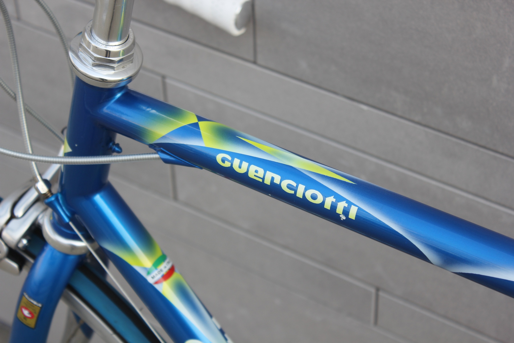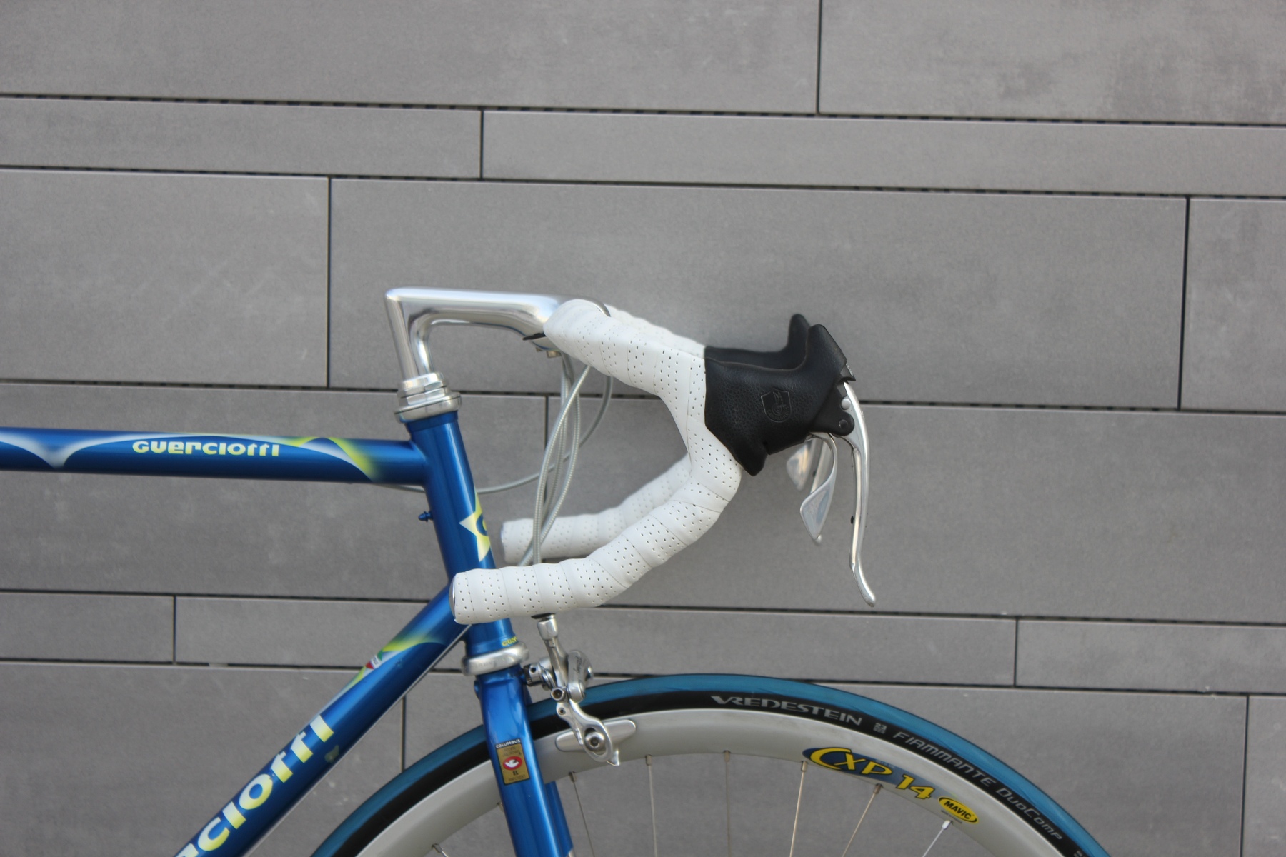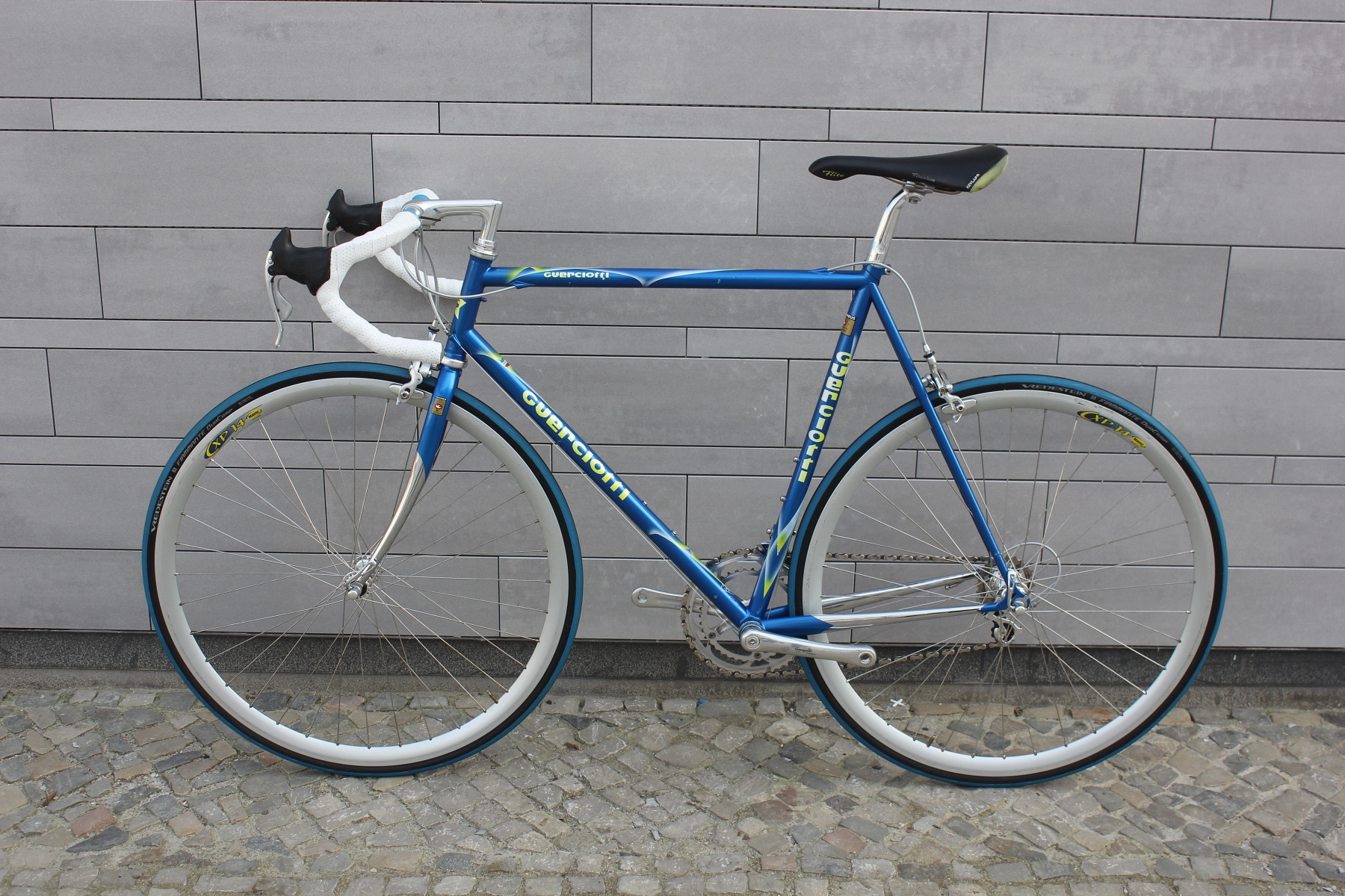 Das hier vorgestellte Guerciotti ist einer der letzten im Hause gefertigten Stahlrahmen aus den späten neunziger Jahren. Gefertigt aus extra leichten Columbus EL Rohren, mit eleganter Zugverlegung um das Steuerrohr und vielen schönen kleinen Details. Sämtliche Rohrformen sind angepasst, die Kettenstreben fast kantig ausgeführt, um optimale Steifigkeit in den Rahmen zu bringen. Lackiert wurde der Rahmen bei Carlo Dossena in Italien. Dossena Lackierungen stehen immer für etwas Besonderes, für Liebe zum Detail und für eine gewisse italienische Extravaganz.
