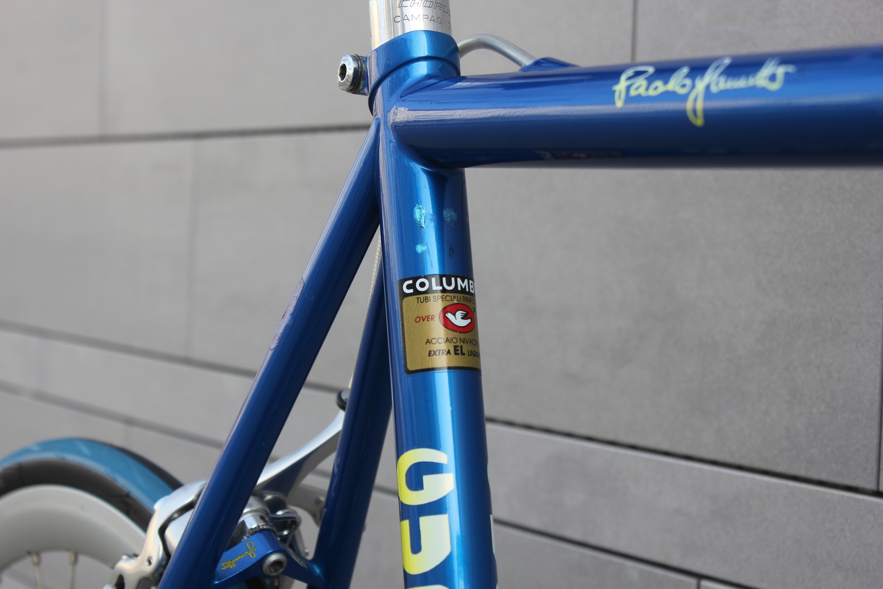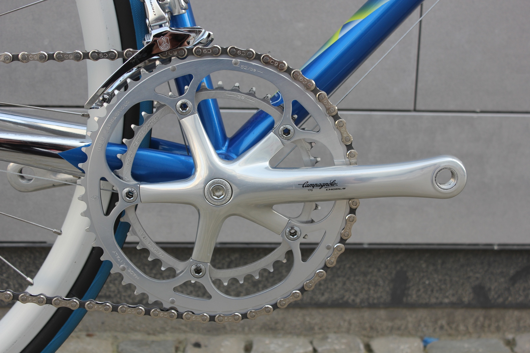 The bike is built with a complete Campagnolo Chorus 9-speed groupset. This groupset works perfectly and does not need to hide behind the Campagnolo Record. It is in near-perfect condition. The frame shows some signs of use, which were touched up by the previous owner.