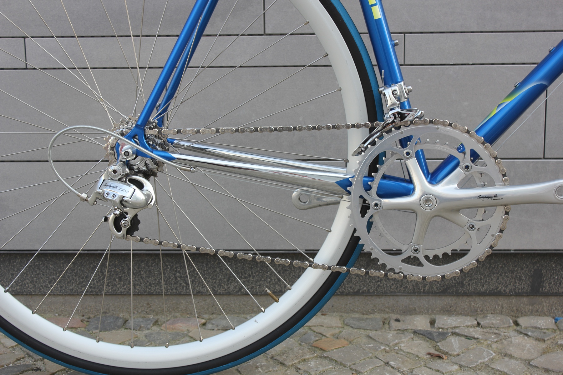 Aufgebaut ist das Rad mit einer kompletten Campagnolo Chorus 9‑fach Gruppe. Diese Gruppe arbeitet perfekt und braucht sich hinter der Campagnolo Record nicht zu verstecken. Die Gruppe befindet sich in einem nahezu perfekten Zustand. Der Rahmen hat einige Gebrauchsspuren, die vom Vorbesitzer ausgebessert wurden.
