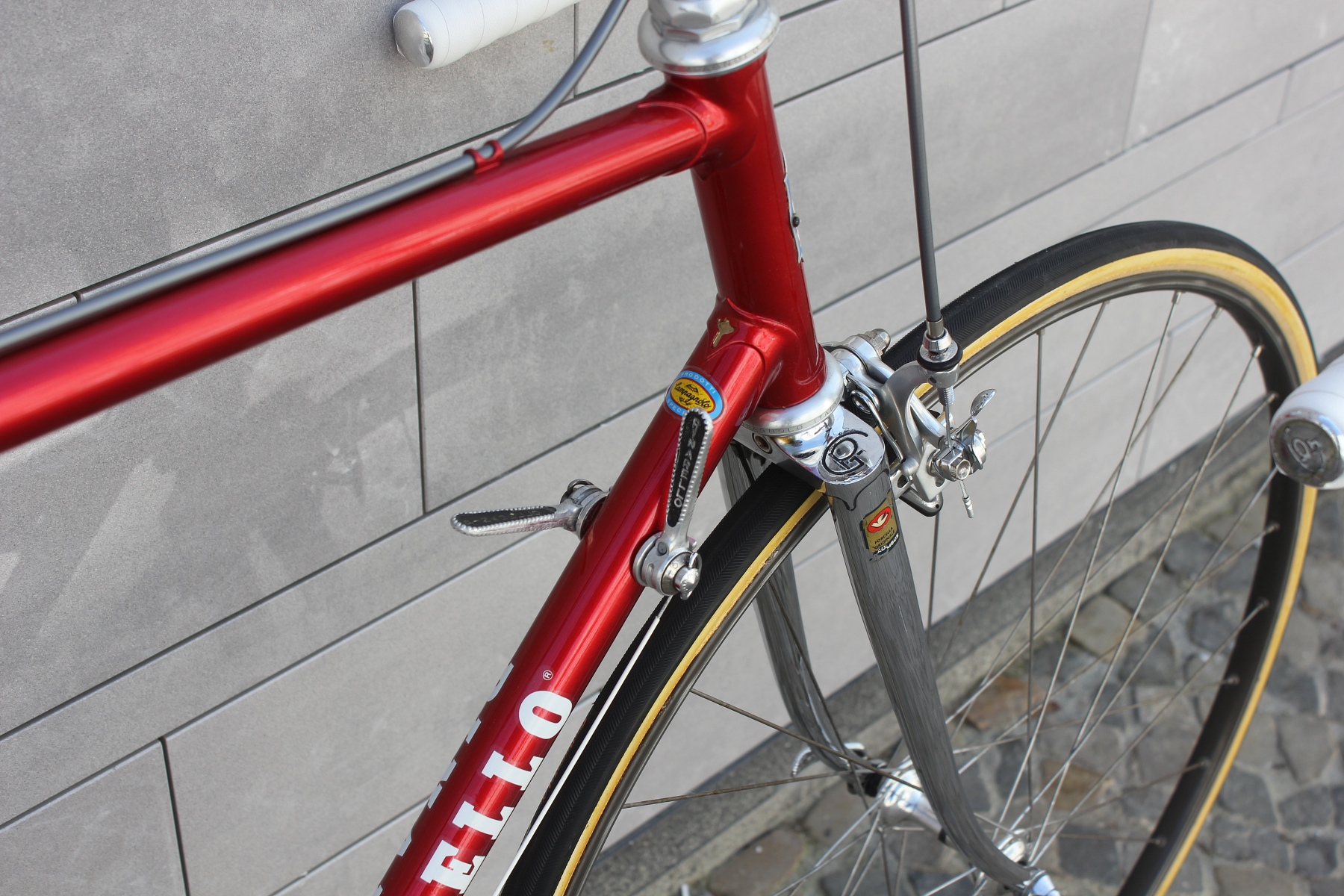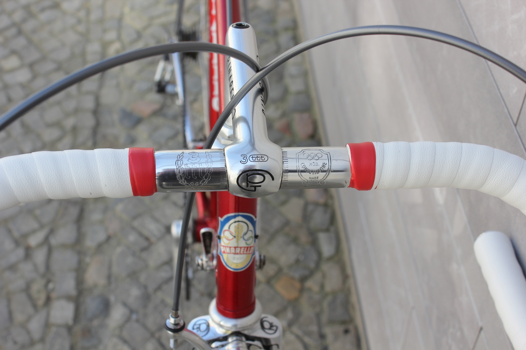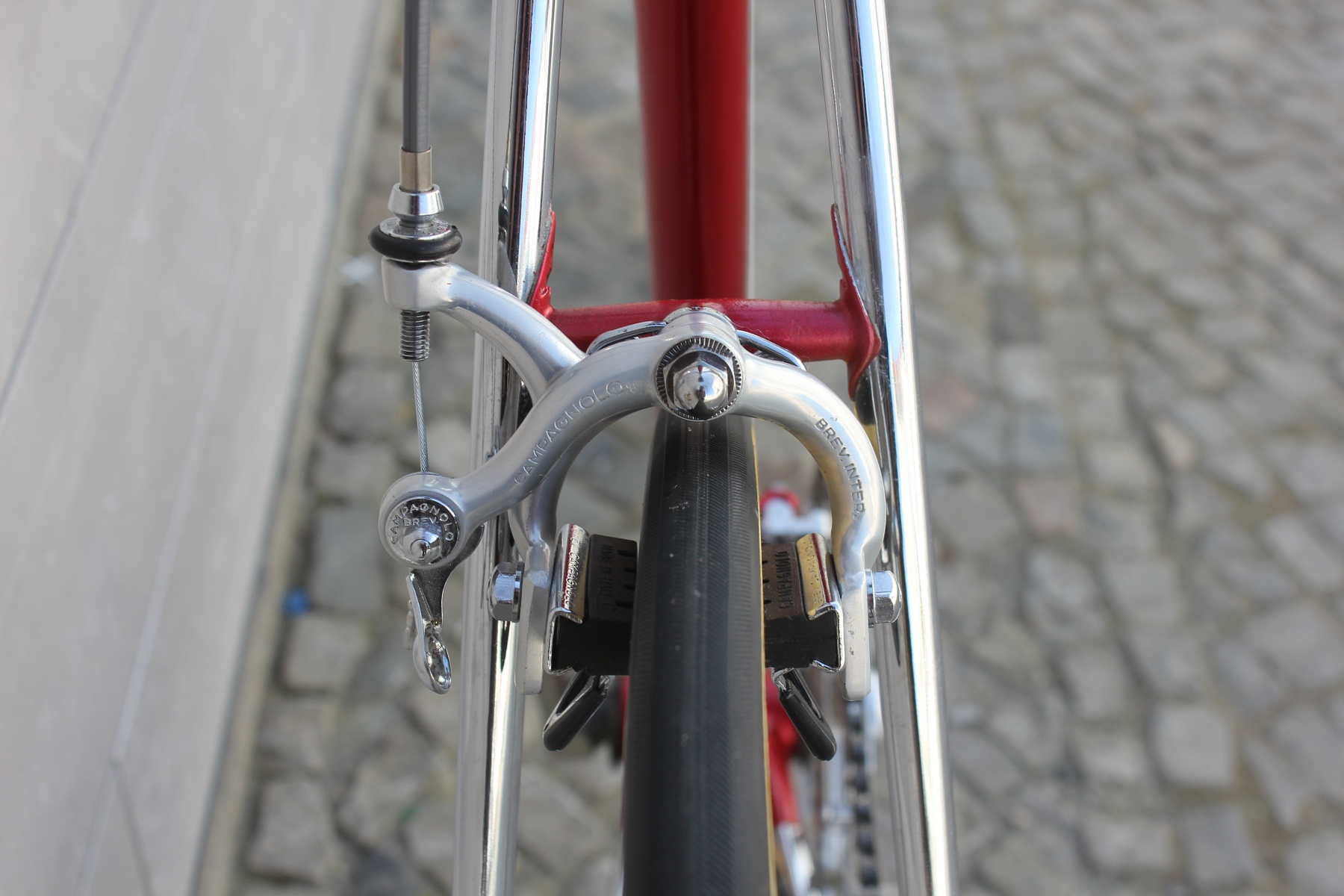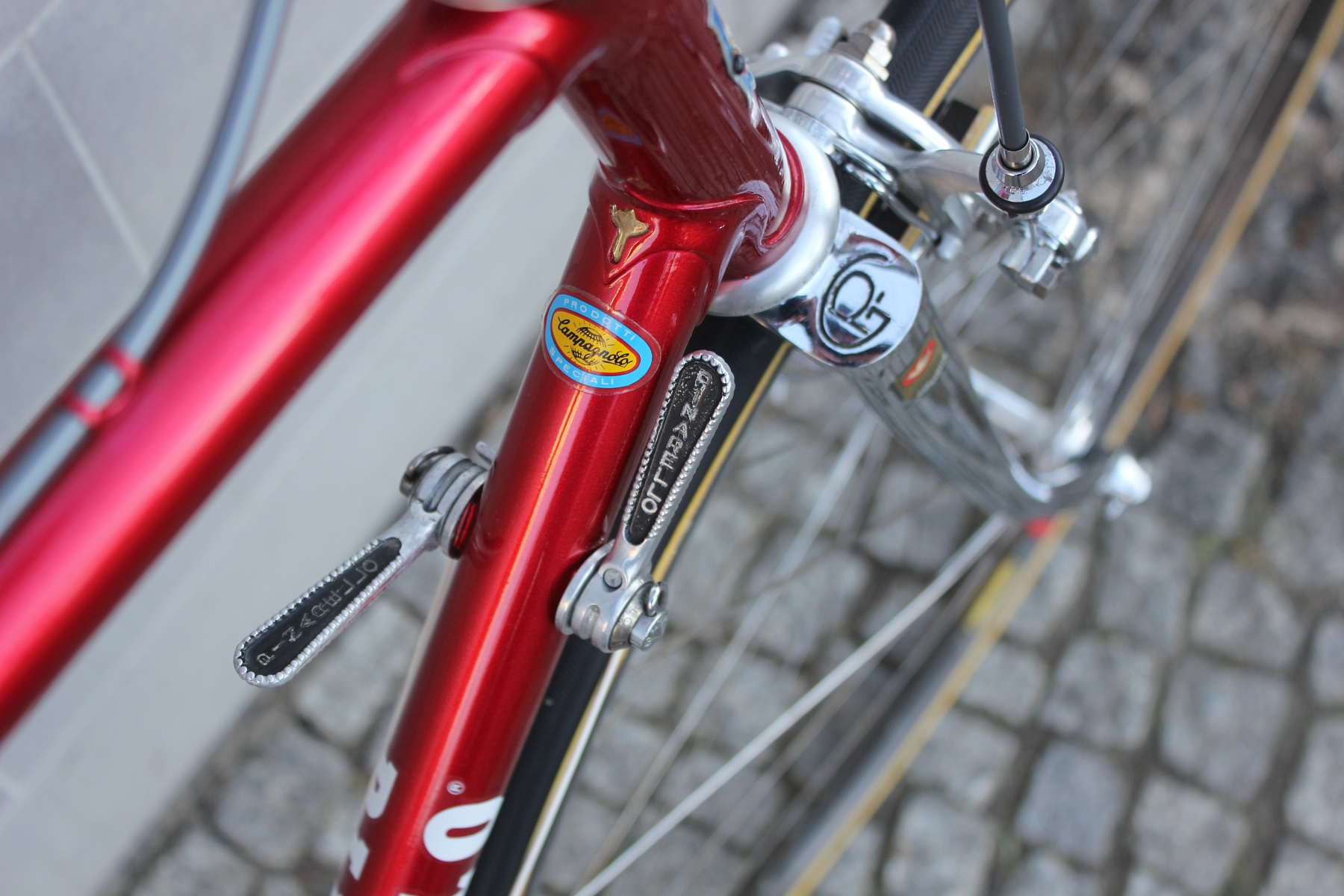 Ausgestattet ist das Rad mit der legendären Campagnolo Super Record Gruppe, die in den 1970er- und 80er-Jahren die erste Wahl im Profipeloton war. Präzise Schaltvorgänge, filigrane Verarbeitung und ikonisches Design machten sie zum Inbegriff italienischer Komponentenbaukunst.