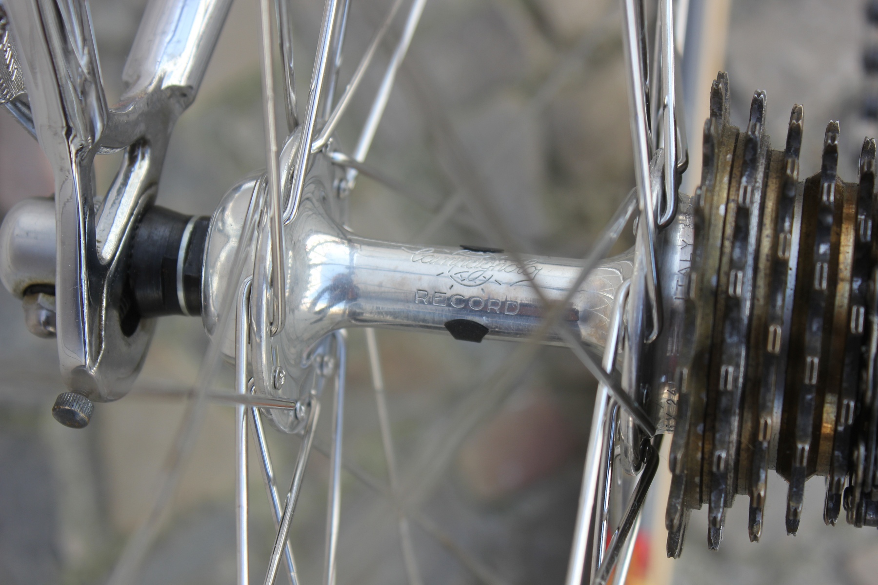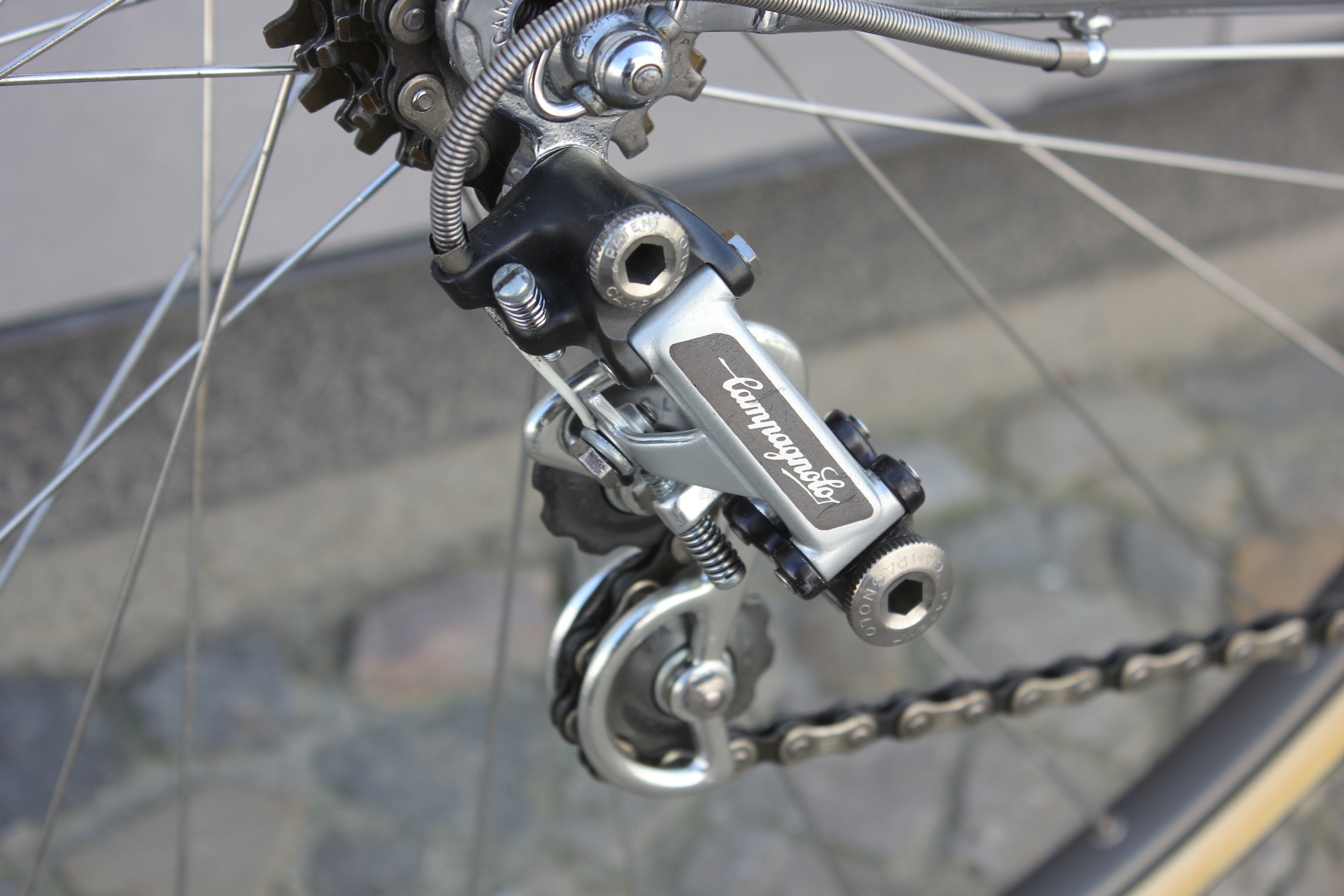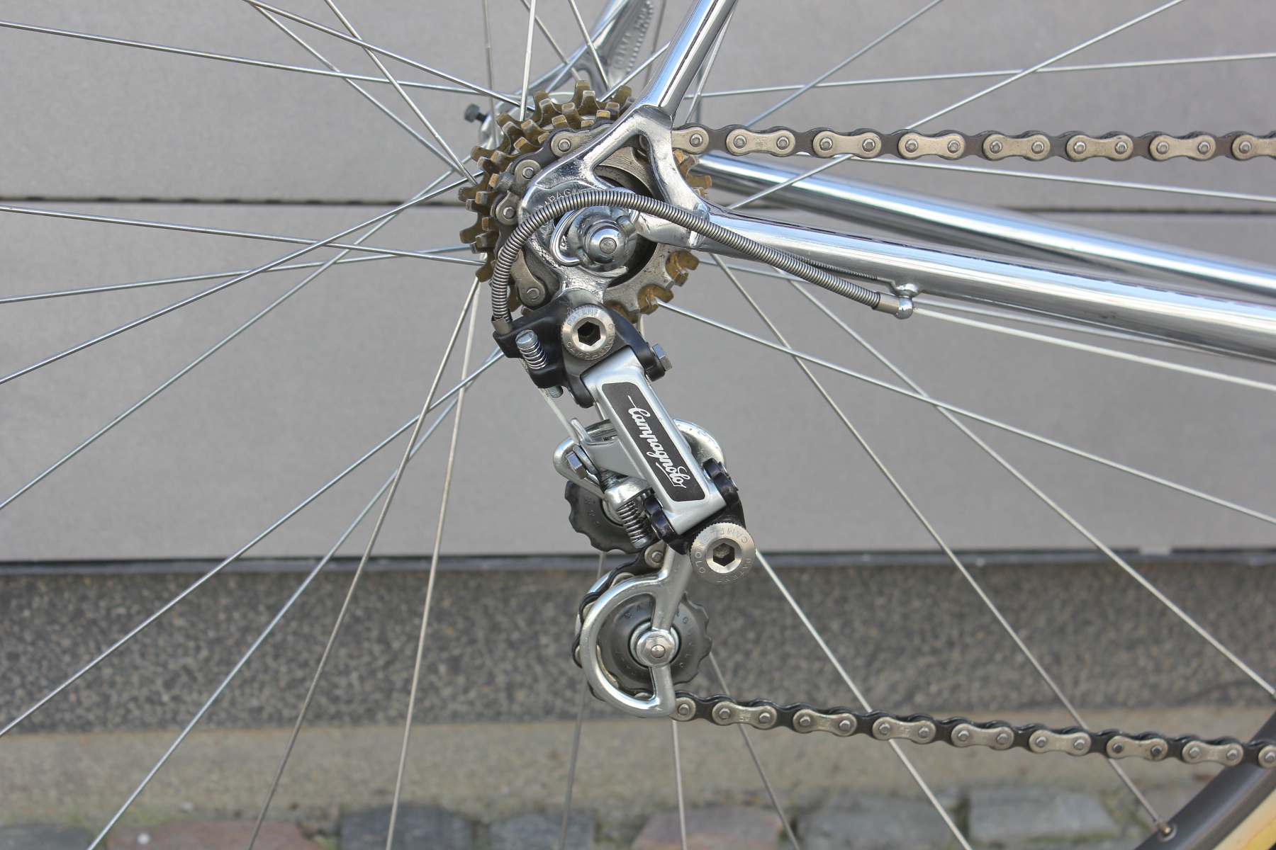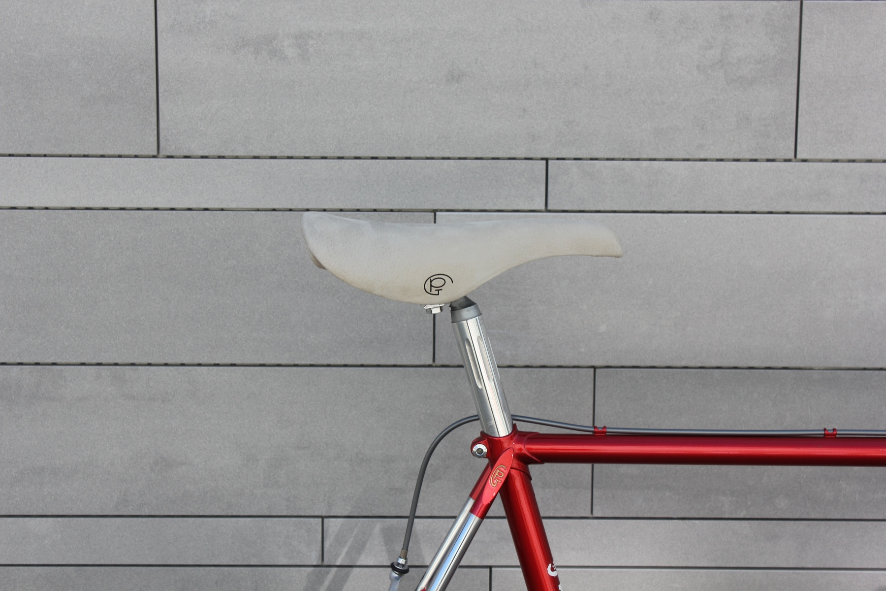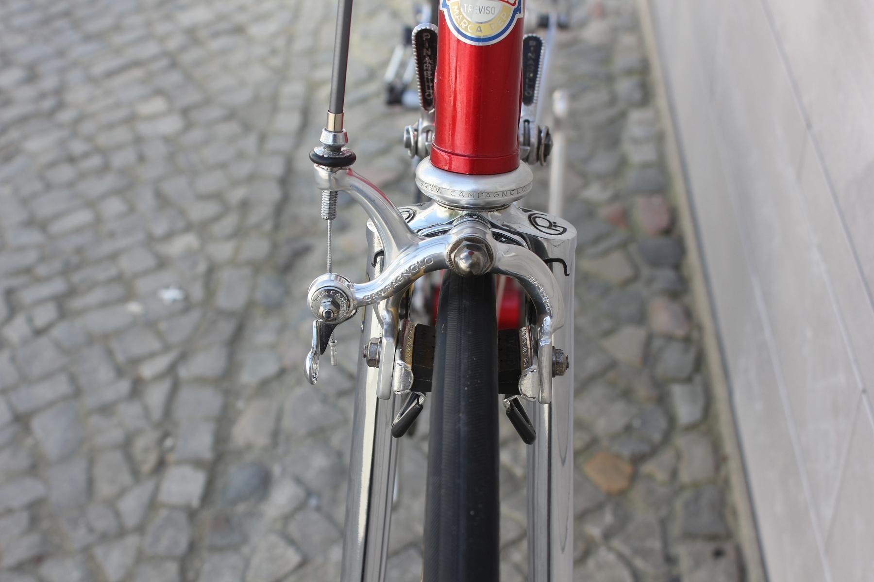 Ausgestattet ist das Rad mit der legendären Campagnolo Super Record Gruppe, die in den 1970er- und 80er-Jahren die erste Wahl im Profipeloton war. Präzise Schaltvorgänge, filigrane Verarbeitung und ikonisches Design machten sie zum Inbegriff italienischer Komponentenbaukunst.