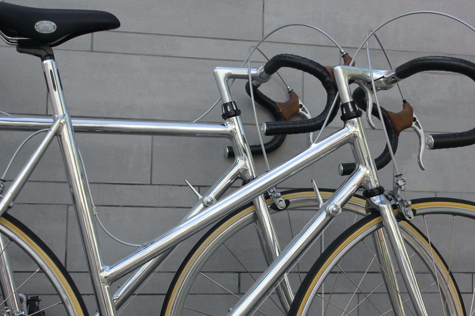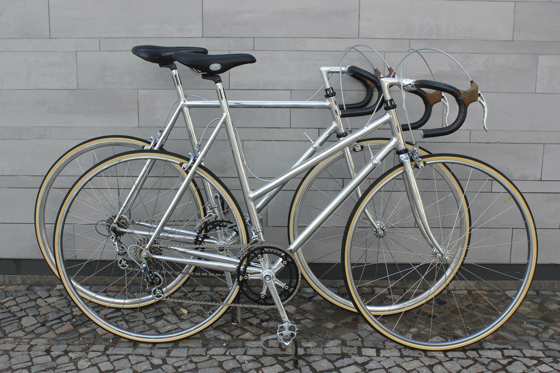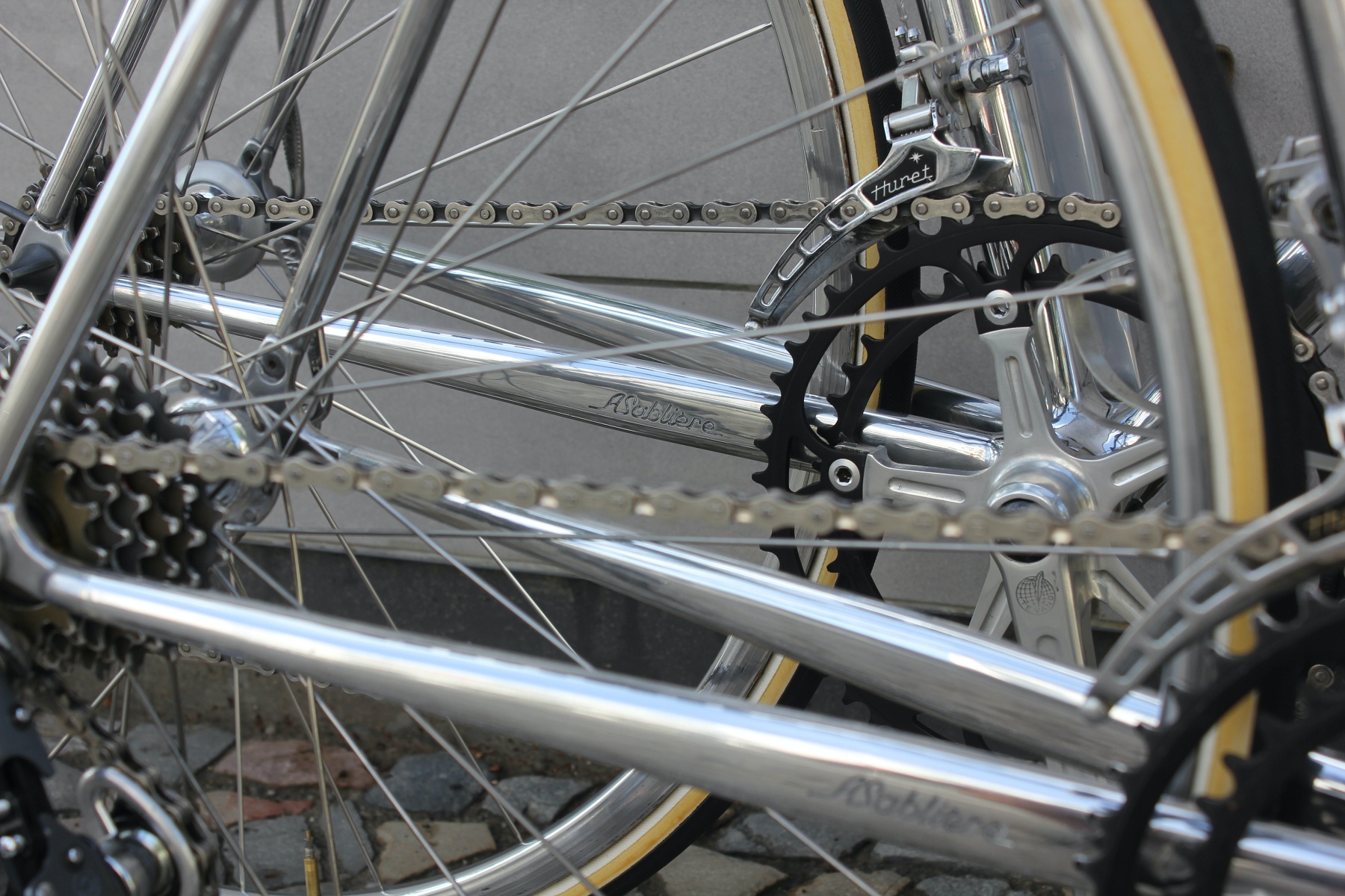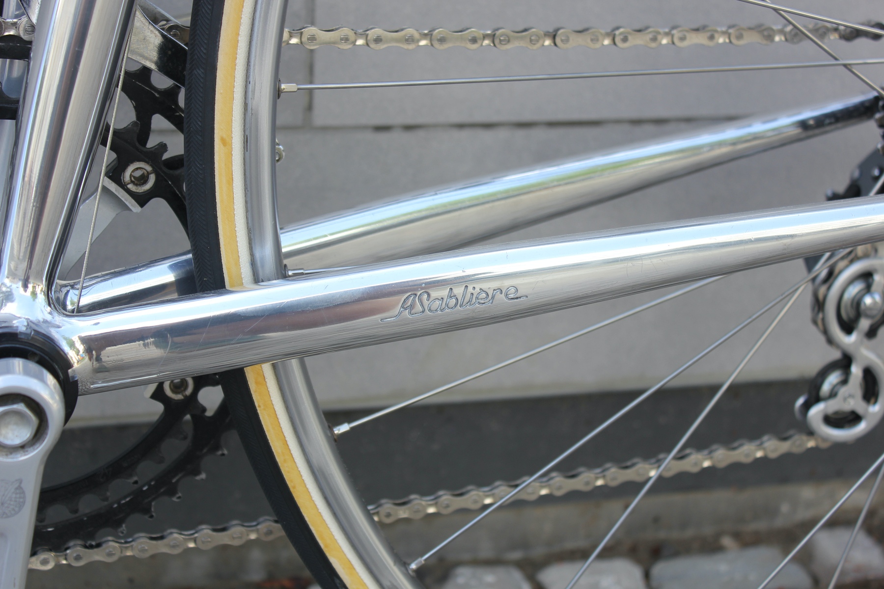 Vor ein paar Tagen hatte ich die Möglichkeit, von einem älteren Ehepaar diese beiden für sie auf Maß gebauten Räder zu kaufen. Gleich zwei dieser Sablière-Räder in Deutschland in diesem Zustand zu bekommen, ist schon eine absolute Besonderheit. Das Ehepaar reiste Ende der Siebziger nach Frankreich, um die Rahmen dort zu bestellen. Sablière hatte beim ersten Besuch jedoch kein großes Interesse daran, für die beiden Deutschen Rahmen zu fertigen. Erst als sie am nächsten Tag mit einem Bekannten erneut die Werkstatt aufsuchten, ließ sich der Meister überzeugen, Rahmen für die beiden zu bauen. Das Ehepaar hatte bei Brügelmann im Laden von Sablière und seinen extra leichten Rädern erfahren. Sie wollten das beste Material für ihr Hobby haben. Bis zur Auslieferung der Räder dauerte es dann allerdings noch über ein Jahr.