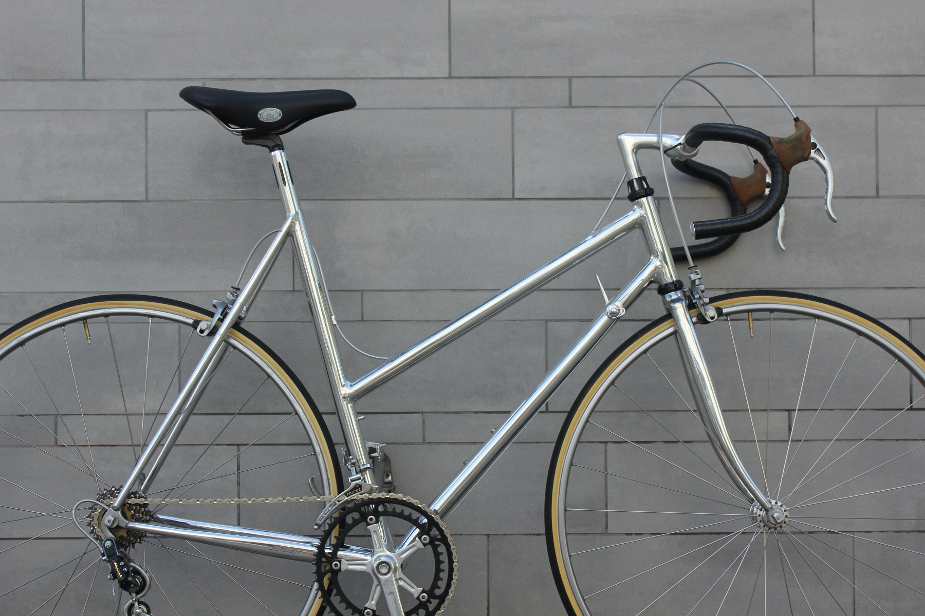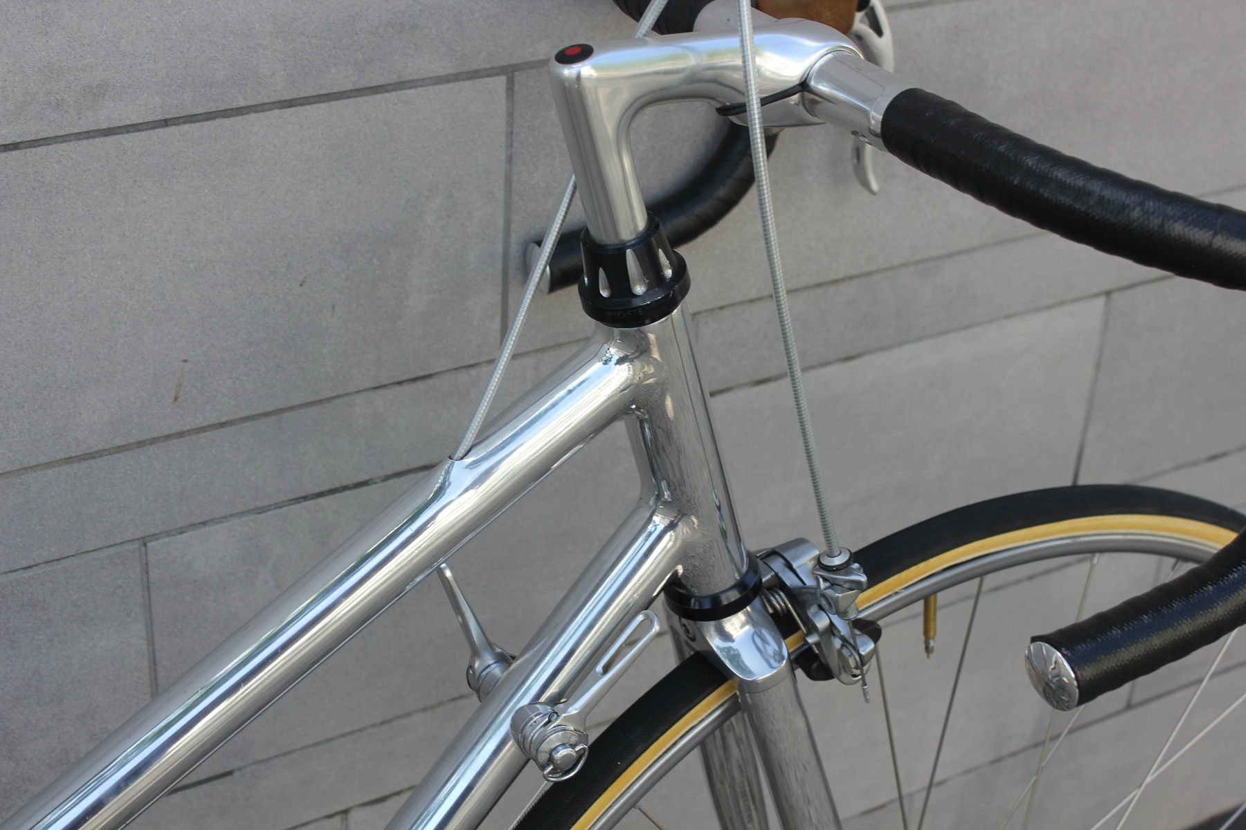 This frame is simply a dream! Women's models from him are very rare to find. Even with this frame, he put in the greatest effort – the frame is even lighter than the men's bike. It is built with the absolute lightest parts of that time. I must briefly mention here that after many Campagnolo Super / C Record builds, I always find joy in the wonderful French parts. Is there a more beautiful headset than the one designed by JP Routens at BF Belleri, weighing only 68g?