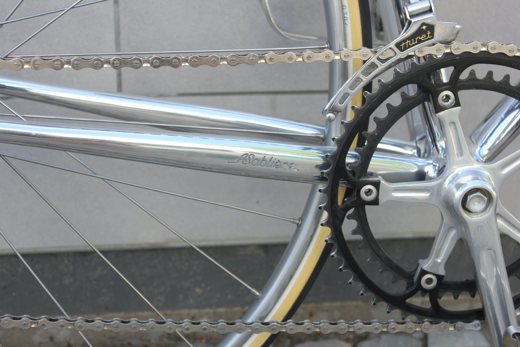 André Sablière ist wieder einer dieser kleinen französischen Konstrukteure, die wahnsinnige Rahmen, weit abseits des Mainstreams gefertigt haben. Jeder seiner Rahmen ist ein Kunstwerk, in mühevoller Handarbeit in vielen Arbeitsstunden gefertigt. Kein Rahmen gleicht dem anderen. Sablière setzte schon früh auf den Werkstoff Aluminium und entwickelte hierzu eine eigene Legierung, die sich besonders für den Bau von Fahrradrahmen eignete. Dieser Rahmen ist komplett aus Aluminium gefertigt, selbst der Gabelschaft und die Ausfallenden. Dies gab es sonst zu dieser Zeit kaum. Sablière war in Sachen Gewicht allen anderen Rahmenbauern zu dieser Zeit deutlich voraus. Wenn man sich auch einmal die ausgeklügelte Zugführung sowohl der Brems- als auch der Schaltzüge anschaut, sieht man diese absolute Liebe zum Detail. Einige Profis sollen sich zu der Zeit leichte Bergräder in Saint-Étienne anfertigen lassen.