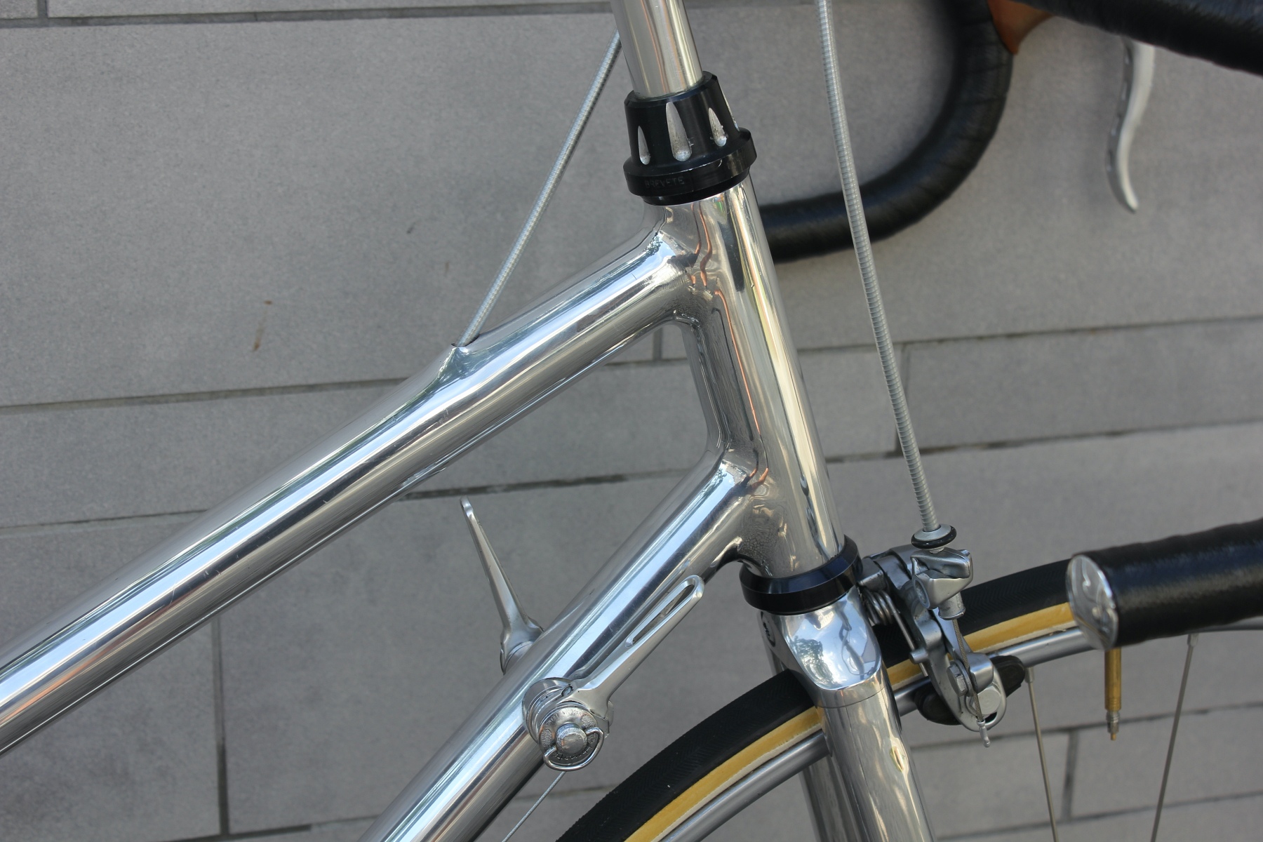 Dieser Rahmen ist einfach ein Traum! Damenmodelle von ihm sind sehr selten zu finden. Auch bei diesem Rahmen hat er sich größte Mühe gegeben – der Rahmen ist noch einmal leichter als das Herrenrad. Aufgebaut ist er mit den absolut leichtesten Teilen dieser Zeit. Ich muss hierzu kurz erwähnen, dass ich mich nach sehr vielen Campagnolo Super / C Record Aufbauten immer wieder an den tollen französischen Teilen erfreuen kann. Gibt es einen schöneren Steuersatz als den bei BF Belleri von JP Routens designten, nur 68g wiegenden?