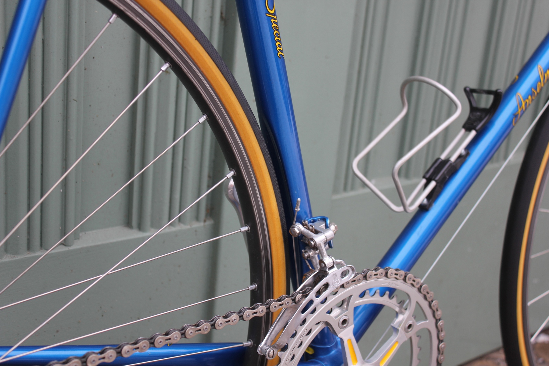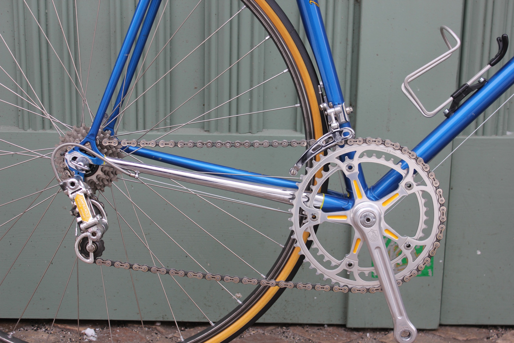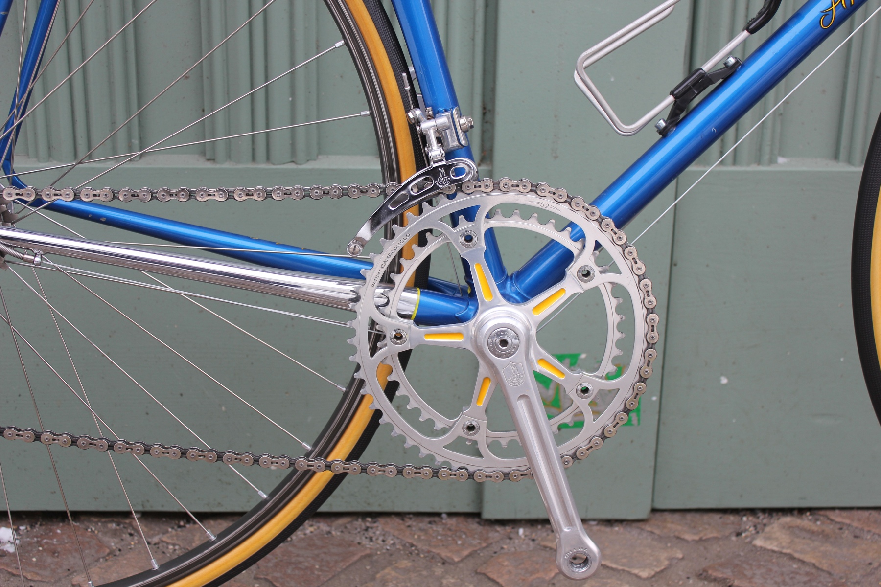 Der Aufbau mit dem blau-gelben Farbkonzept setzt sich vom Rahmen bis hin zu den farblich ausgelegten Anbauteilen fort. Hier kommt natürlich eine Campagnolo Record Gruppe zum Einsatz.
