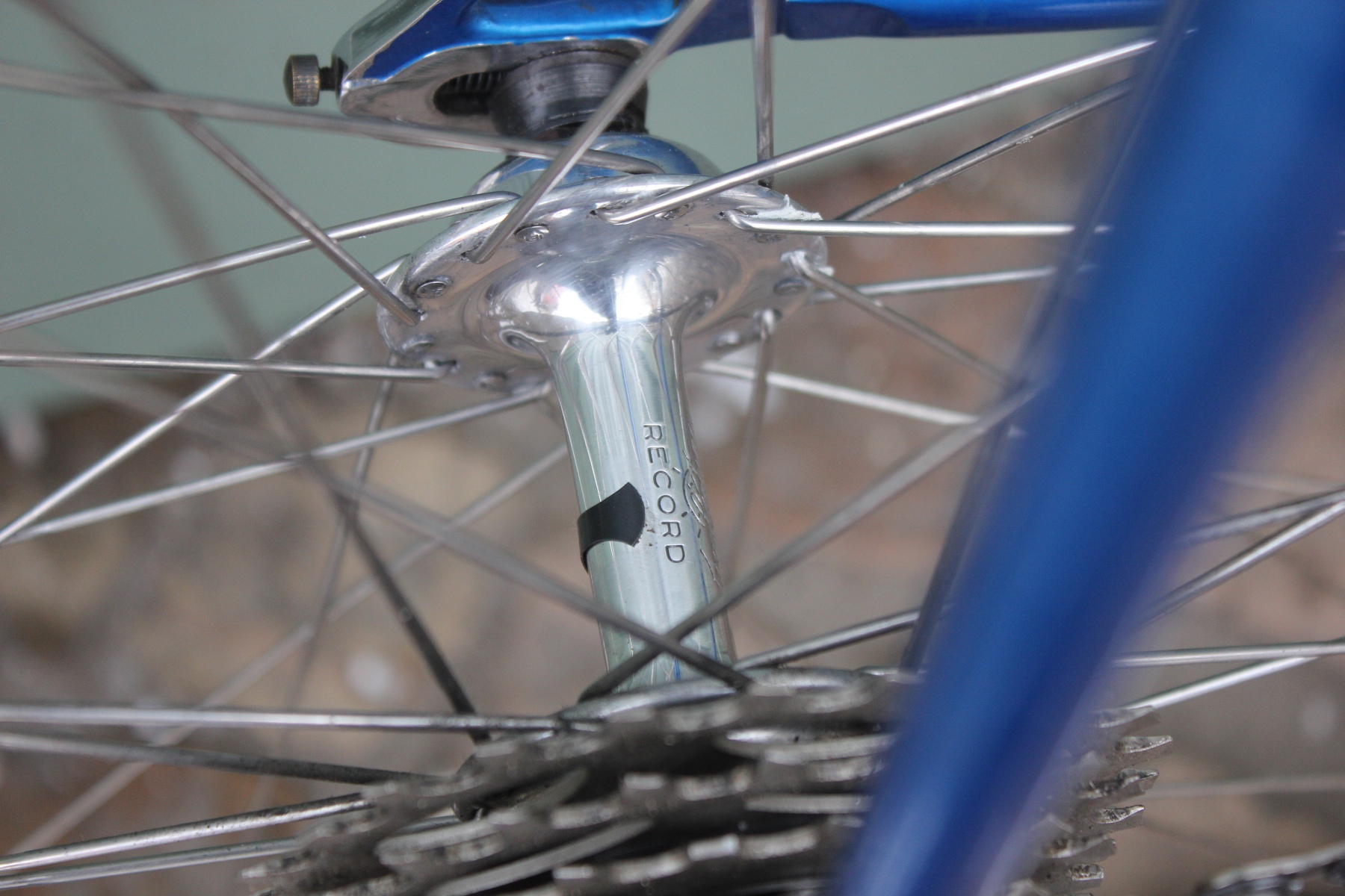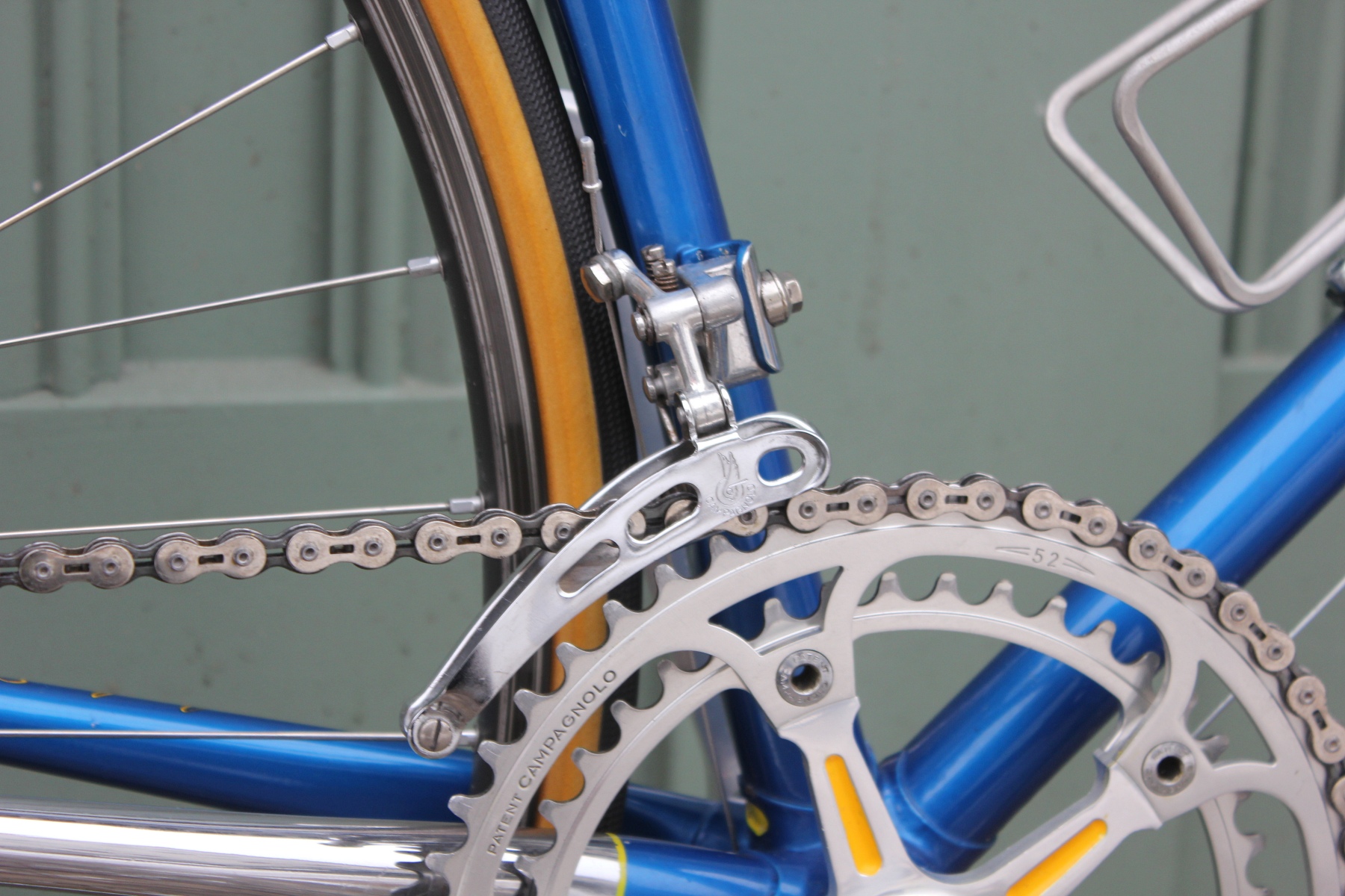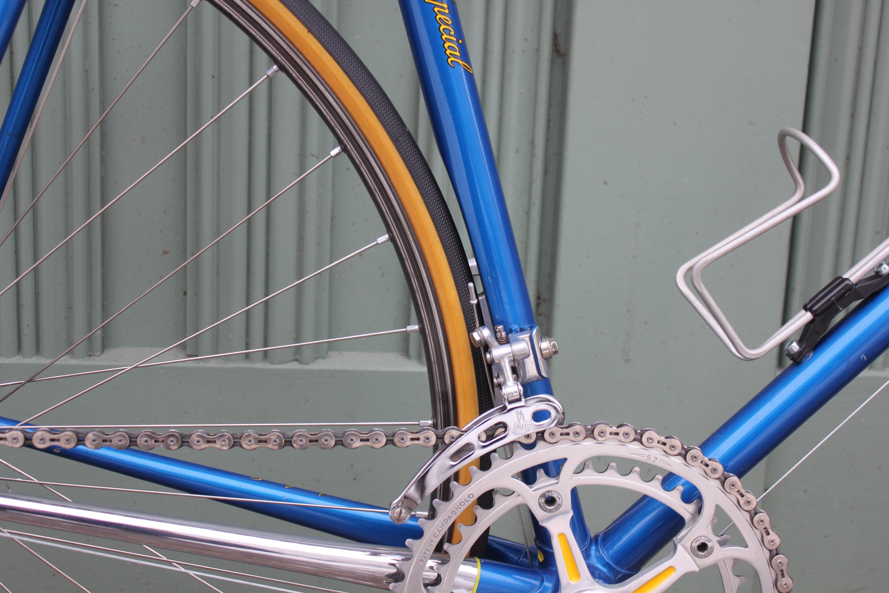Der Aufbau mit dem blau-gelben Farbkonzept setzt sich vom Rahmen bis hin zu den farblich ausgelegten Anbauteilen fort. Hier kommt natürlich eine Campagnolo Record Gruppe zum Einsatz.