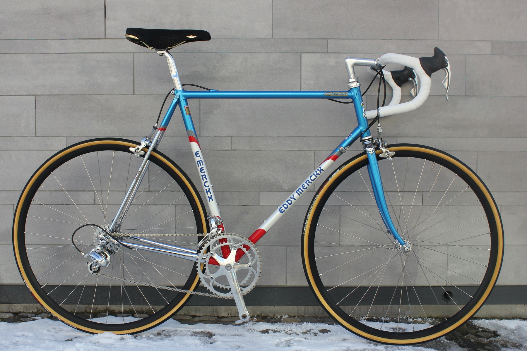 The "Corsa Extra" presented here is brazed from Columbus SLX tubes and painted in "Team Motorola colors". The Columbus SLX tube set was one of the top tube sets at the time, stiffer than the SL and used by many high end frame builders for the top of the line models. The "Corsa Extra" frame is extremely popular with many riders due to its tremendous smoothness and stiffness while still being very comfortable. At Merckx, the customer had the option of having his frame painted and chromed with many options. This customer, in addition to wanting the Motorola paint job, also wanted as much chrome as possible. Here, for example, the fork crown is also still chrome-plated and additionally highlights the pantographs. It is these "little things" that make the difference to so many other racing bikes. Endgeben the construction of the Motorola team (Shimano Dura Ace) the first owner wanted to have his bike rather "classic" Campa equipped. I think that a Campagnolo Record group from the time already with 8 compartment Ergopower shifters on this great frame but also fits very well.