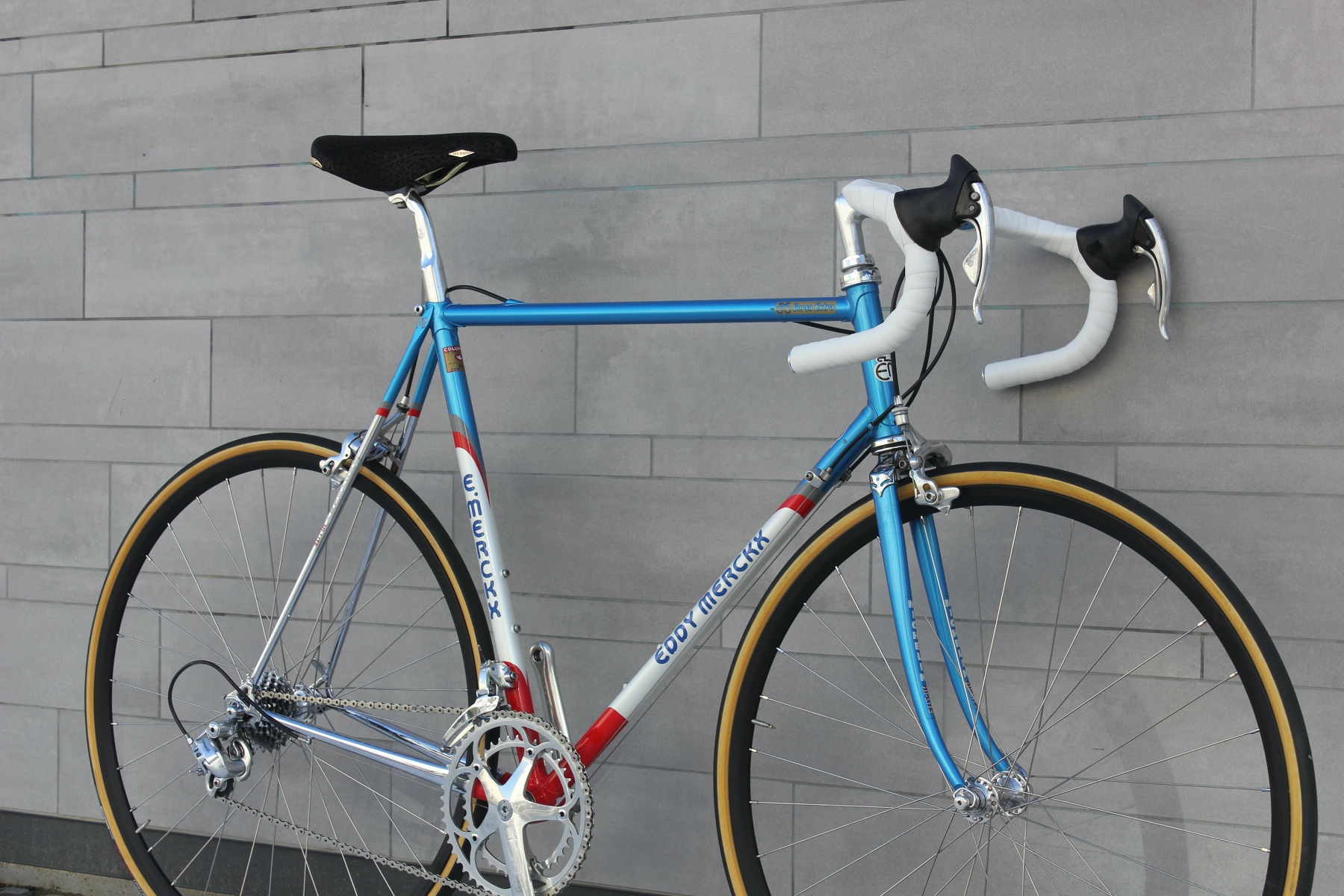 Das hier vorgestellte "Corsa Extra" ist aus Columbus SLX Rohren gelötet und in "Team Motorola Farben" lackiert. Der Columbus SLX Rohrsatz war zu dieser Zeit einer der top Rohrsätze, steifer als der SL und wurde von vielen hochwertigen Rahmenbauern für die Topmodelle verwendet. Der "Corsa Extra" Rahmen ist bei vielen Fahrern aufgrund seiner enormen Laufruhe und Steifigkeit bei trotzdem sehr hohem Komfort ausgesprochen beliebt. Bei Merckx hatte der Kunde die Möglichkeit, sich seinen Rahmen mit vielen Optionen lackieren und verchromen zu lassen. Dieser Kunde wollte neben dem Wunsch der Motorola Lackierung auch noch möglichst viel Chrom. Hier ist beispielsweise auch der Gabelkopf noch verchromt und hebt die Pantographien zusätzlich hervor. Es sind diese "Kleinigkeiten", die den Unterschied zu so vielen anderen Rennrädern ausmachen. Endgeben dem Aufbau des Motorola Teams (Shimano Dura Ace) wollte der Erstbesitzer sein Rad lieber „klassisch" Campa bestückt haben. Ich denke, dass eine Campagnolo Record Gruppe aus der Zeit schon mit 8 Fach Ergopower Schalthebeln an diesen tollen Rahmen aber auch sehr gut passt.
