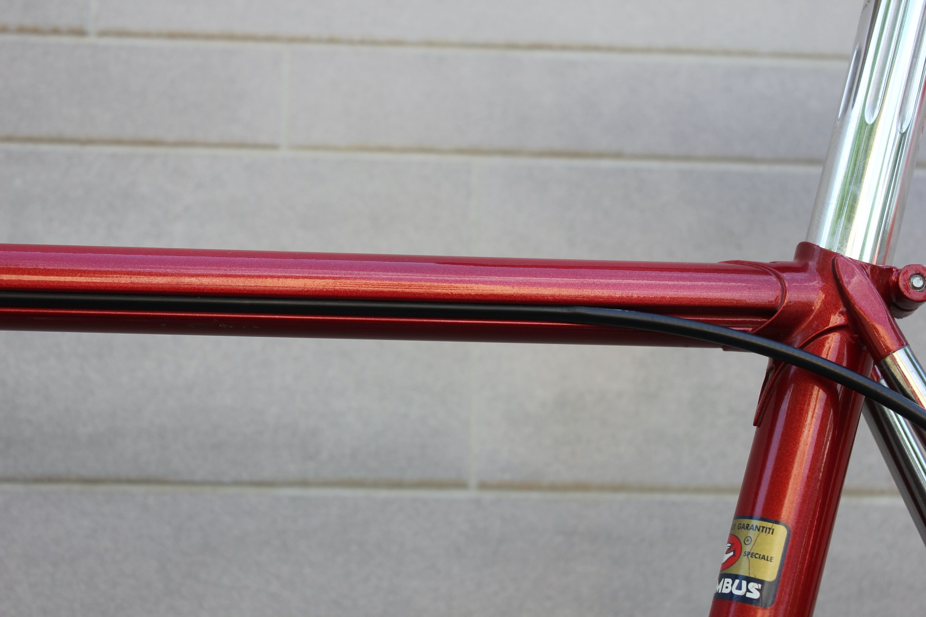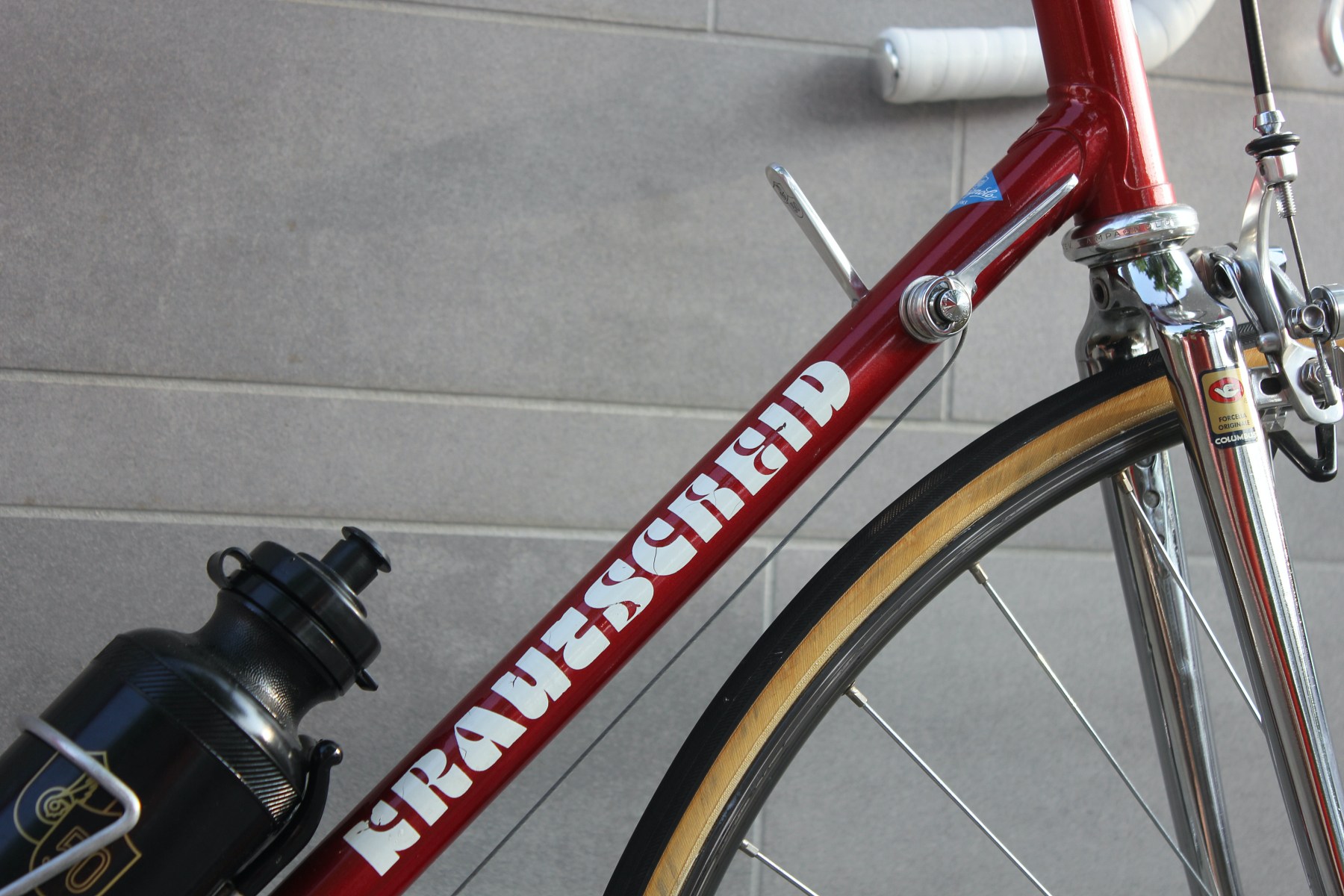 Wenn man an Räder aus der Zeit um 1983, als die Gruppe auf den Markt kam denkt, so hat man meist die großen italienischen Hersteller wie Colnago, Pinarello Bianchi ect. im Hinterkopf, aber auf einen Rahmen von Günter Krautscheid aus Bochum kommt man erst einmal nicht direkt. Völlig zu Unrecht! Wer sich einmal diesen, wie jeden Krautscheid auf Maß gebauten Rahmen ansieht, der erkennt sofort das handwerkliche Know-how dahinter. Die Zeitschrift Tour hat vor vielen Jahren dazu einmal einen großen Artikel über Günter Krautscheid veröffentlicht (Siehe Bildergalerie) und spricht davon, dass die besseren Rahmen im italienischen Design, eigentlich aus Bochum kommen. Die Führung des Bremszugs im Oberrohr ist optisch, wie technisch kaum zu übertreffen hinzukommen extrem gefeilte Muffen, die langen Gabelscheiden auf der Innenseite der Gabel, die Cinelli Tretlagermuffe, die Krautscheid aufbohrte und Feuchtigkeit aus dem Rahmen zu bekommen und um Gewicht zu sparen, die Art und Weise die Sitzstreben an das Sattelrohr zu löten - dieser Rahmen bietet so vieles, was die Serienrahmen aus Italien eher vermissen ließen. Günter Krautscheid wusste, was einen richtigen Rennradrahmen ausmacht. Er fuhr selber viele Jahre erfolgreich im Amateurbereich Rennrad. Auch die Lackierung des Rahmens ist von sehr guter Qualität. Alles in allem kann ich sagen, dass dies einer der besten Rahmen ist, den ich in meiner Zeit von Vintage Velo je in den Händen gehabt habe. Geringes Gewicht, extrem hohe Genauigkeit beim Rahmenbau und top Lackierung.