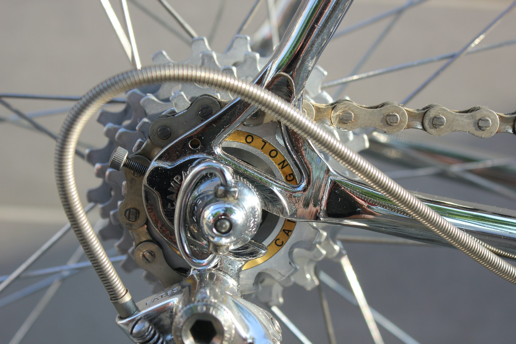Der legendäre Campagnolo Schraubkranz aus Aluminium, der übrigens nicht zur Gruppe gehört, darf an diesem Rad natürlich auch nicht fehlen.