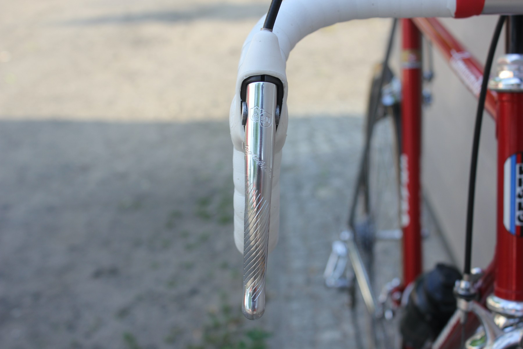Hier passt dann auch die Campagnolo 50th Anniversery Gruppe zum 50. Geburtstag der italienischen Traditionsmarke perfekt. Auch die Gruppe wurde noch einmal von Krautscheid bearbeiet. Er hat ein paar Teile der Gruppe modifiziert - aber keine Sorge, alle Originalen gibt es beschriftet natürlich dazu. Die Kettenblattschrauben wurden hier durch Aluschräubchen ersetzt. Kurbelschrauben ebenfalls. Die Bolzen der Bremse sind ebenfalls leichteren gewichen. Wie gesagt, der Rückbau kann jederzeit erfolgen, da alle Teile vorhanden sind. Auch der Concor Profil Sattel ist absoluter Leichtbau mit einem Gestell aus Aluminium. (Ich habe ihn so noch nie gesehen)