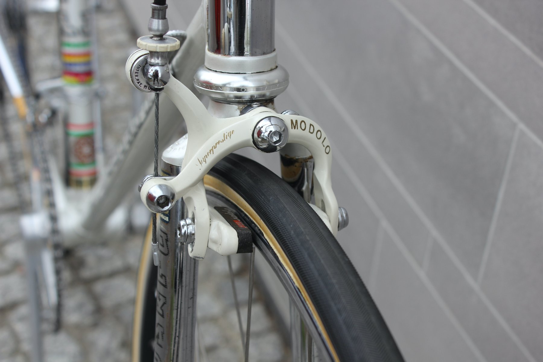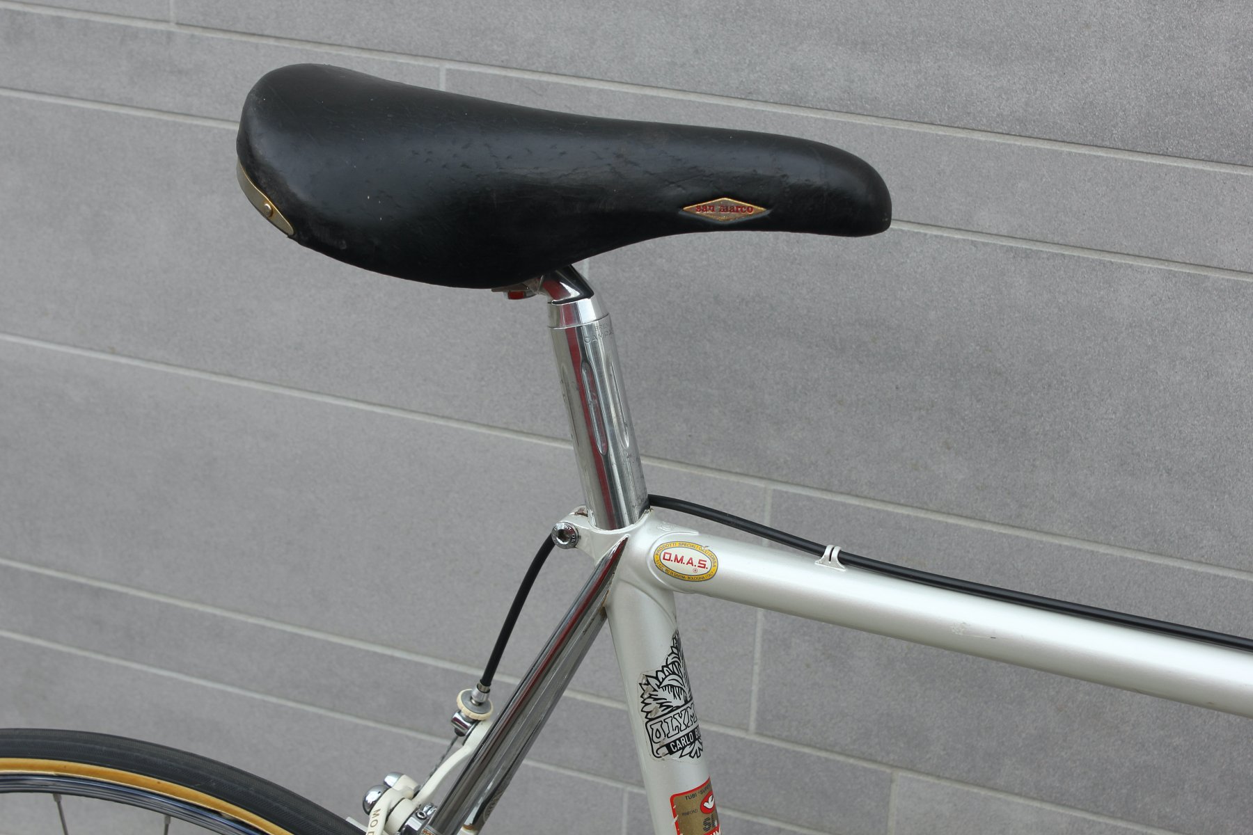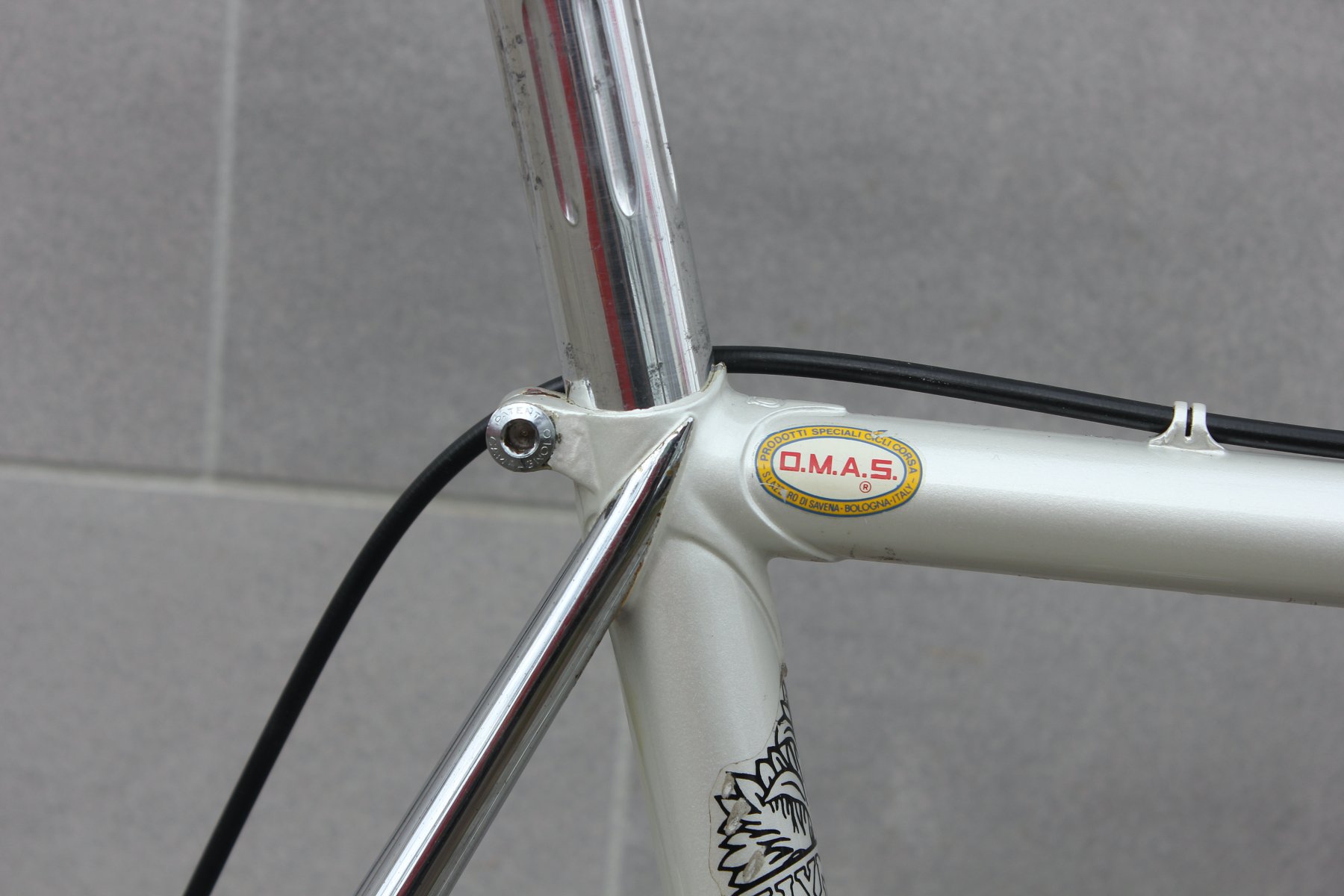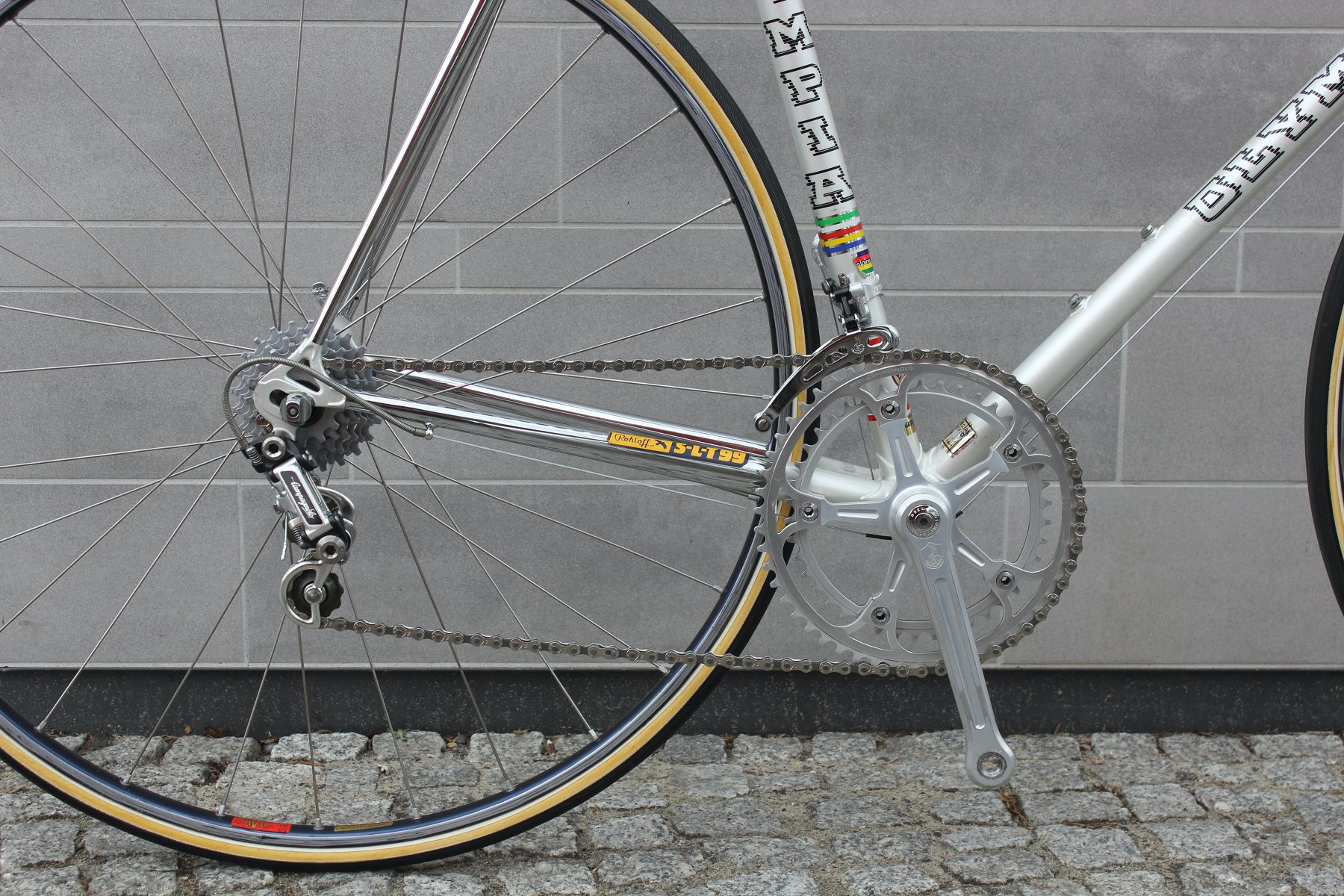 The bike presented here dates from the mid-eighties and represented the best model from Olympia at the time. The frame is made of high-quality, spiral-reinforced Columbus SLX tubes. Typical for Olympia is the engraved emblem in the head tube and the typical chromed rear end with the extra nice strut attachment to the seat tube. Also the elaborately decorated sleeves make this also very light frame a special feature. Built up the wheel is predominantly with an excellently preserved Campagnolo Super Record group. The high-quality brakes from Modolo match the mother-of-pearl paint of the frame perfectly in terms of color. A Cinelli cockpit, O.M.A.S titanium bottom bracket, classy blue Mavic S.S.C wheelset with Mavic 501 hubs round out this classic.