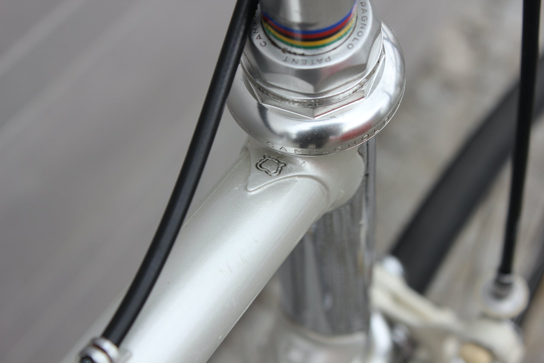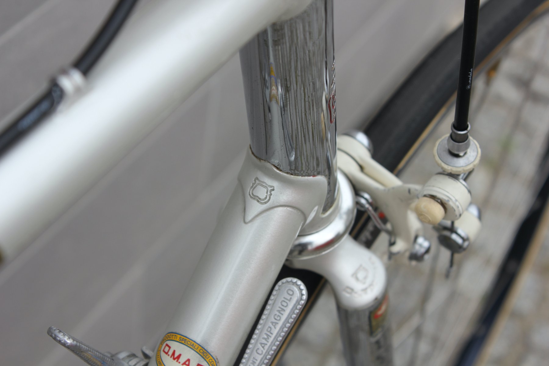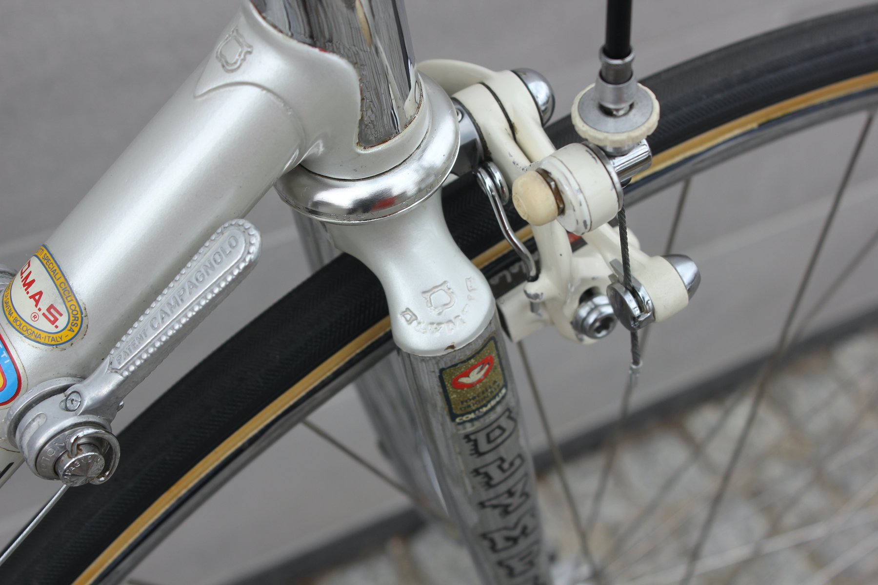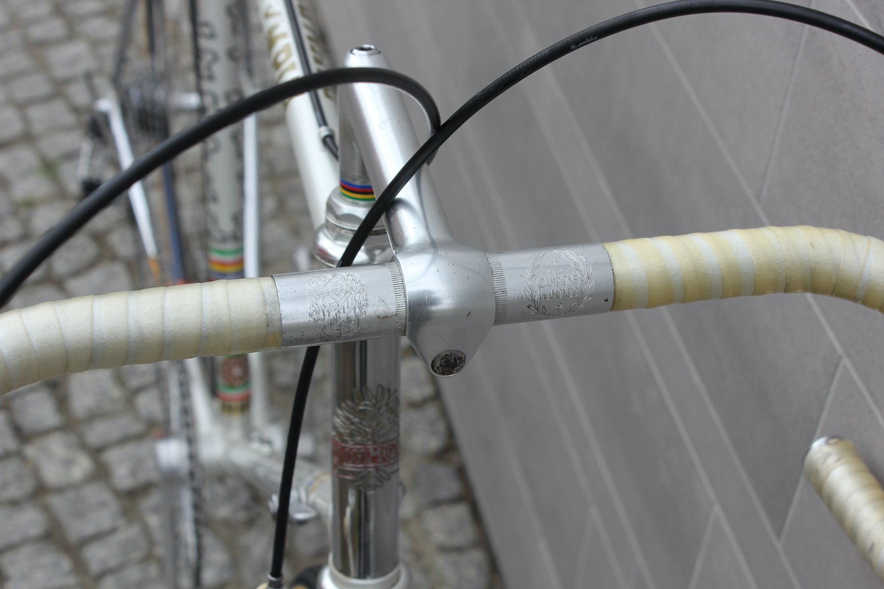 The bike presented here dates from the mid-eighties and represented the best model from Olympia at the time. The frame is made of high-quality, spiral-reinforced Columbus SLX tubes. Typical for Olympia is the engraved emblem in the head tube and the typical chromed rear end with the extra nice strut attachment to the seat tube. Also the elaborately decorated sleeves make this also very light frame a special feature. Built up the wheel is predominantly with an excellently preserved Campagnolo Super Record group. The high-quality brakes from Modolo match the mother-of-pearl paint of the frame perfectly in terms of color. A Cinelli cockpit, O.M.A.S titanium bottom bracket, classy blue Mavic S.S.C wheelset with Mavic 501 hubs round out this classic.