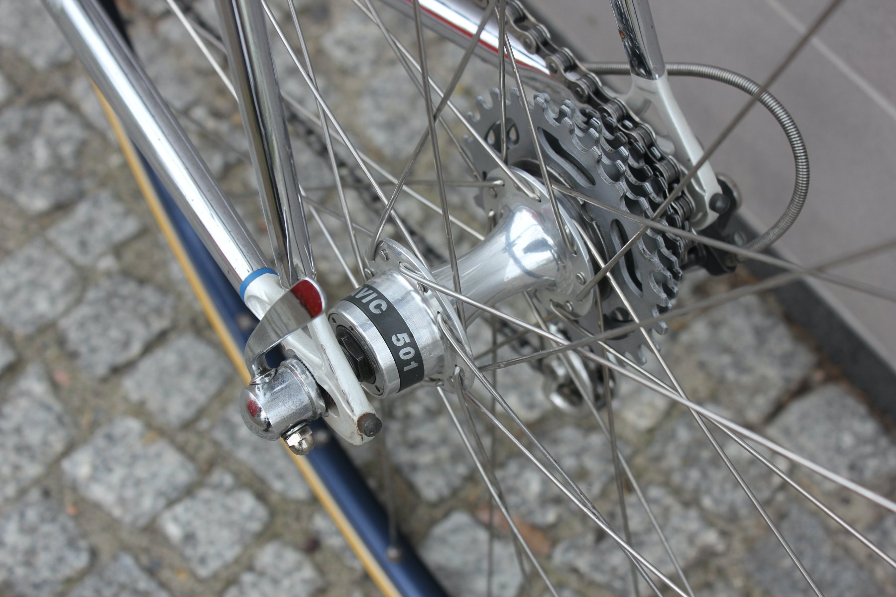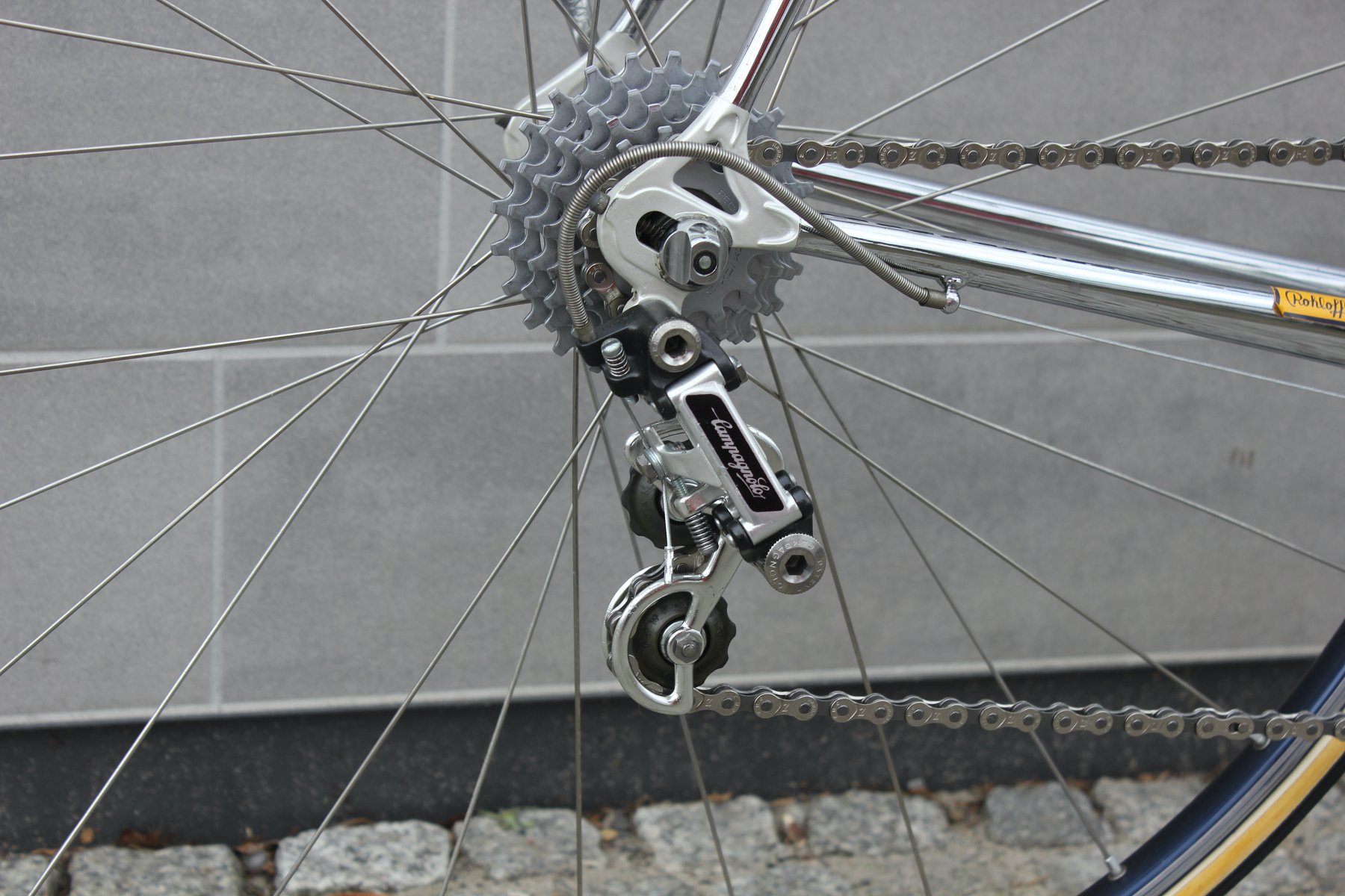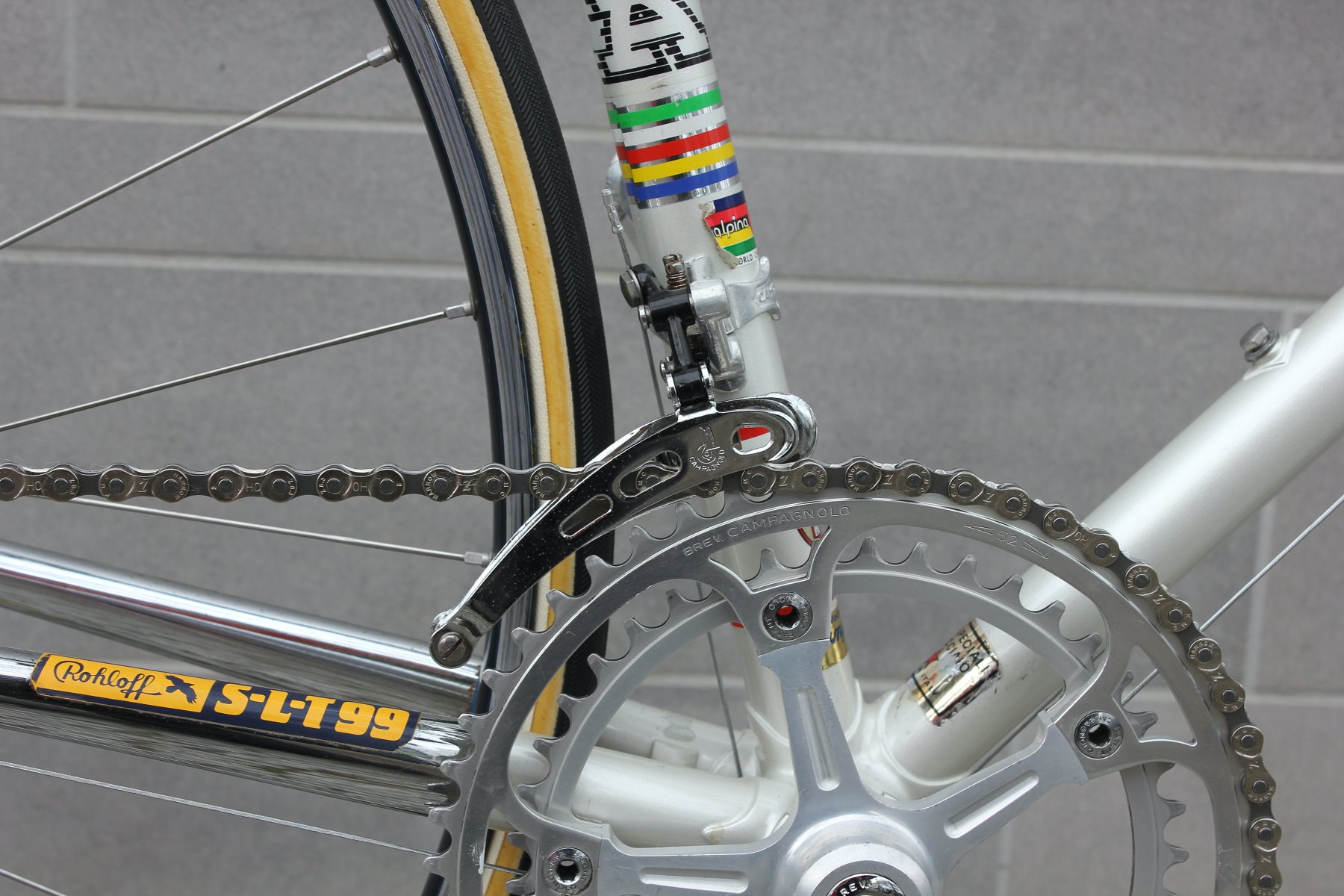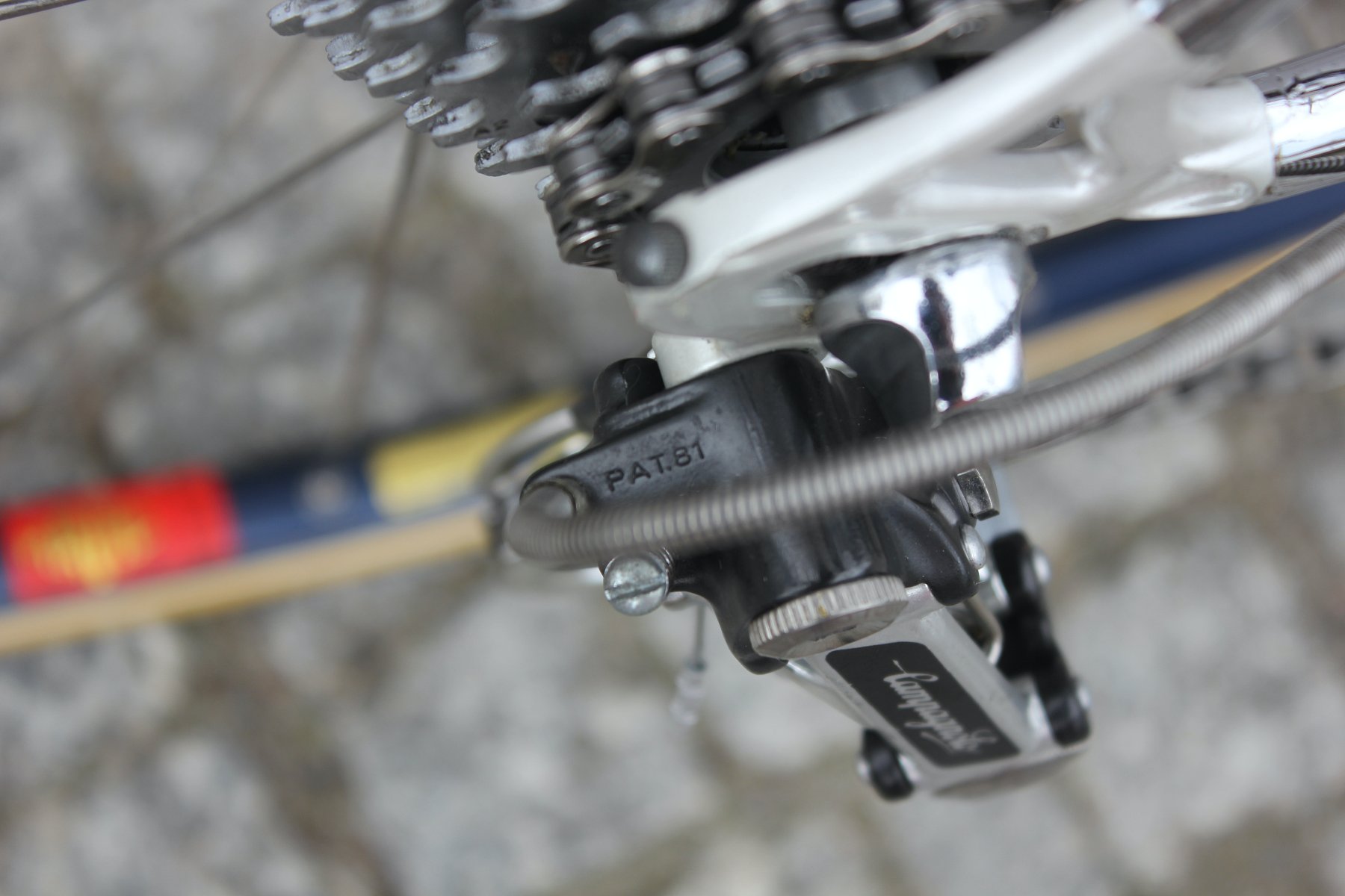 The bike presented here dates from the mid-eighties and represented the best model from Olympia at the time. The frame is made of high-quality, spiral-reinforced Columbus SLX tubes. Typical for Olympia is the engraved emblem in the head tube and the typical chromed rear end with the extra nice strut attachment to the seat tube. Also the elaborately decorated sleeves make this also very light frame a special feature. Built up the wheel is predominantly with an excellently preserved Campagnolo Super Record group. The high-quality brakes from Modolo match the mother-of-pearl paint of the frame perfectly in terms of color. A Cinelli cockpit, O.M.A.S titanium bottom bracket, classy blue Mavic S.S.C wheelset with Mavic 501 hubs round out this classic.