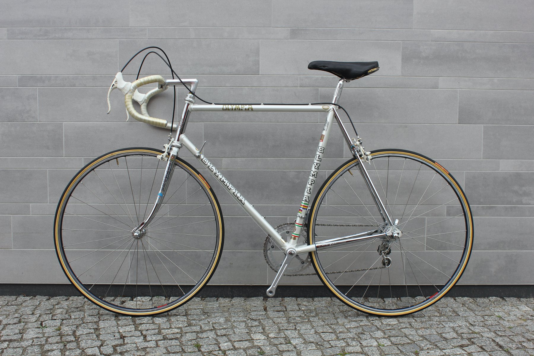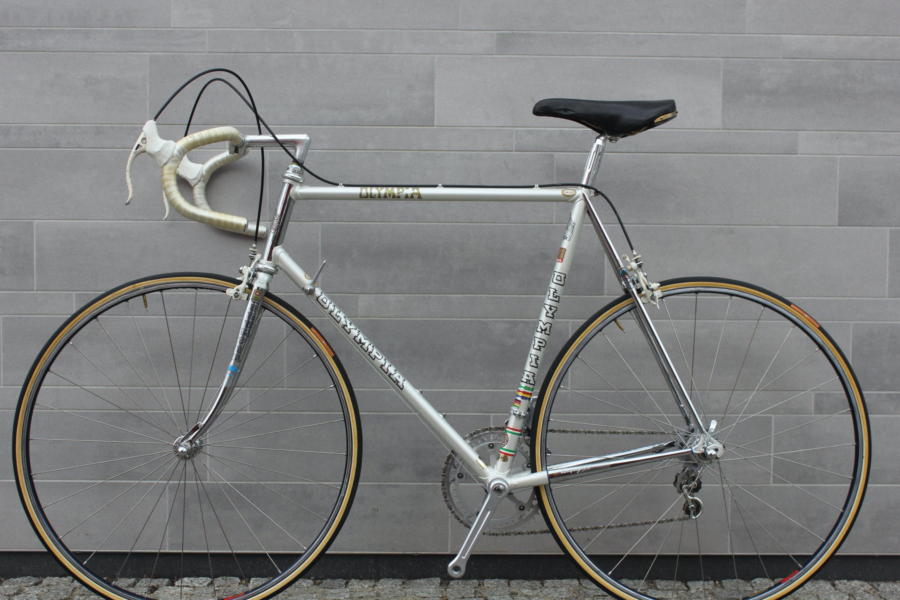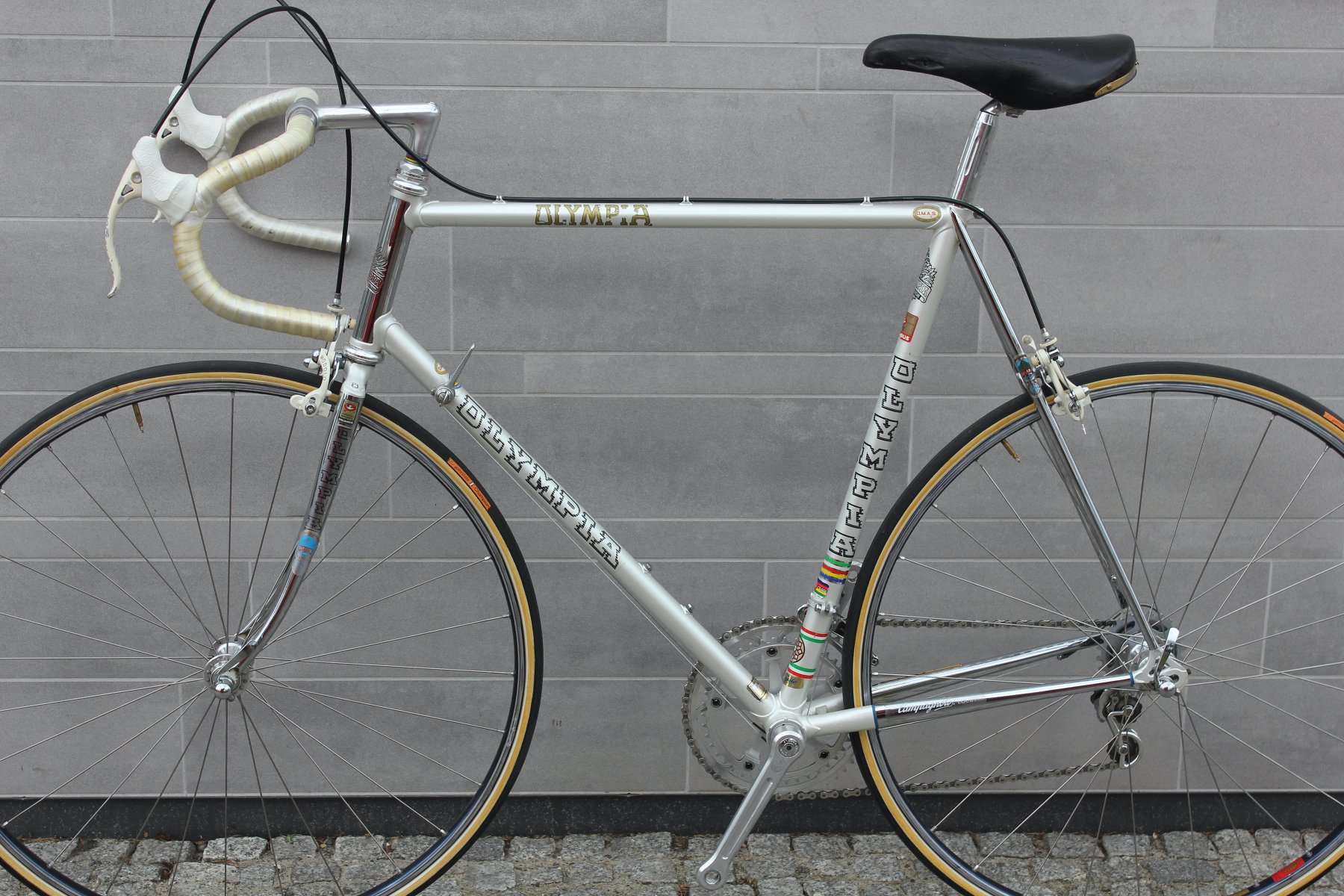 Das hier vorgestellte Rad stammt aus Mitte der Achtziger Jahre und stellte damals das beste Modell aus dem Hause Olympia dar. Der Rahmen ist aus hochwertigen, spiralverstärkten Columbus SLX Rohren gefertigt. Typisch für Olympia ist das gravierte Emblem im Steuerrohr und der typisch verchromte Hinterbau mit der extra schöne Strebenanlegung ans Sattelrohr. Auch die aufwendig verzierten Muffen machen diesen ebenfalls sehr leichten Rahmen zu einer Besonderheit. Aufgebaut ist das Rad überwiegend mit einer hervorragend erhaltenen Campagnolo Super Record Gruppe. Die hochwertigen Bremsen von Modolo passen farblich perfekt zur Perlmutt-Lackierung des Rahmens. Brügelmann hat diese damls exklusiv in Deutschland für sagenhafte 400DM angeboten! Ein Cinelli Cockpit, O.M.A.S Titan Innenlager, der edle blaue Mavic S.S.C Laufradsatz mit den Mavic 501 Naben runden diesen Klassiker ab.