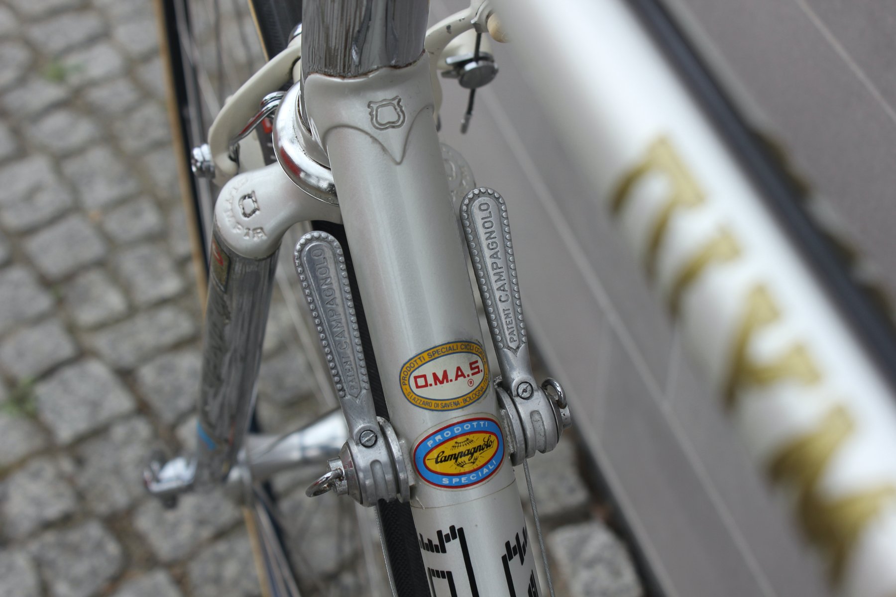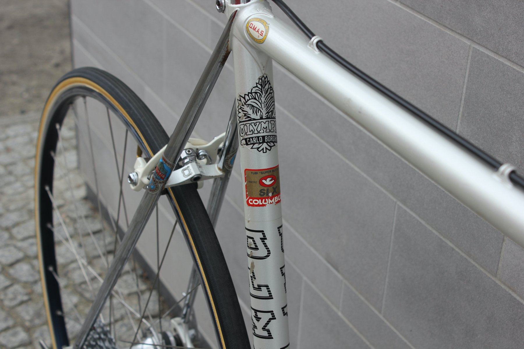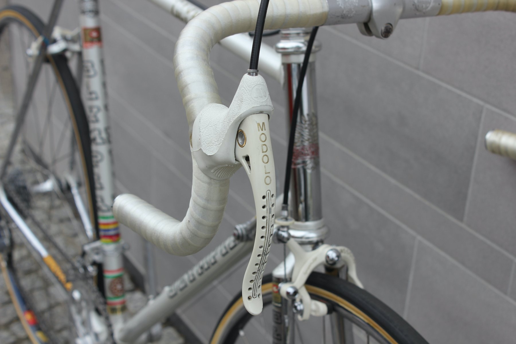 Das hier vorgestellte Rad stammt aus Mitte der Achtziger Jahre und stellte damals das beste Modell aus dem Hause Olympia dar. Der Rahmen ist aus hochwertigen, spiralverstärkten Columbus SLX Rohren gefertigt. Typisch für Olympia ist das gravierte Emblem im Steuerrohr und der typisch verchromte Hinterbau mit der extra schöne Strebenanlegung ans Sattelrohr. Auch die aufwendig verzierten Muffen machen diesen ebenfalls sehr leichten Rahmen zu einer Besonderheit. Aufgebaut ist das Rad überwiegend mit einer hervorragend erhaltenen Campagnolo Super Record Gruppe. Die hochwertigen Bremsen von Modolo passen farblich perfekt zur Perlmutt-Lackierung des Rahmens. Brügelmann hat diese damls exklusiv in Deutschland für sagenhafte 400DM angeboten! Ein Cinelli Cockpit, O.M.A.S Titan Innenlager, der edle blaue Mavic S.S.C Laufradsatz mit den Mavic 501 Naben runden diesen Klassiker ab.