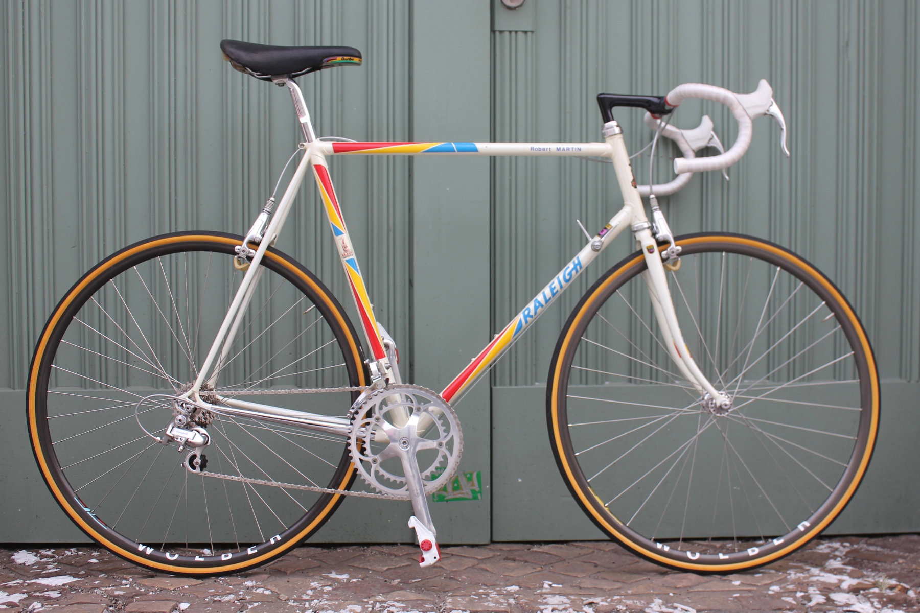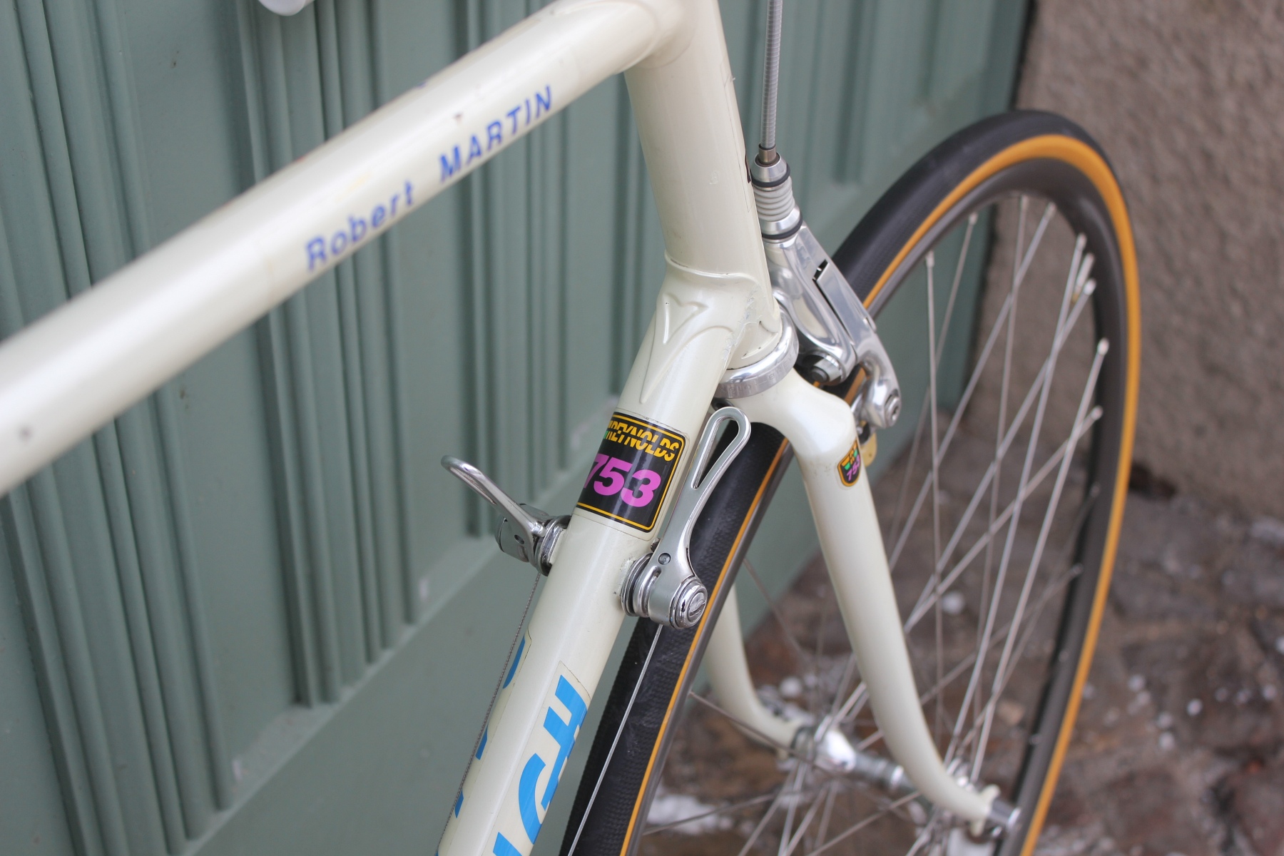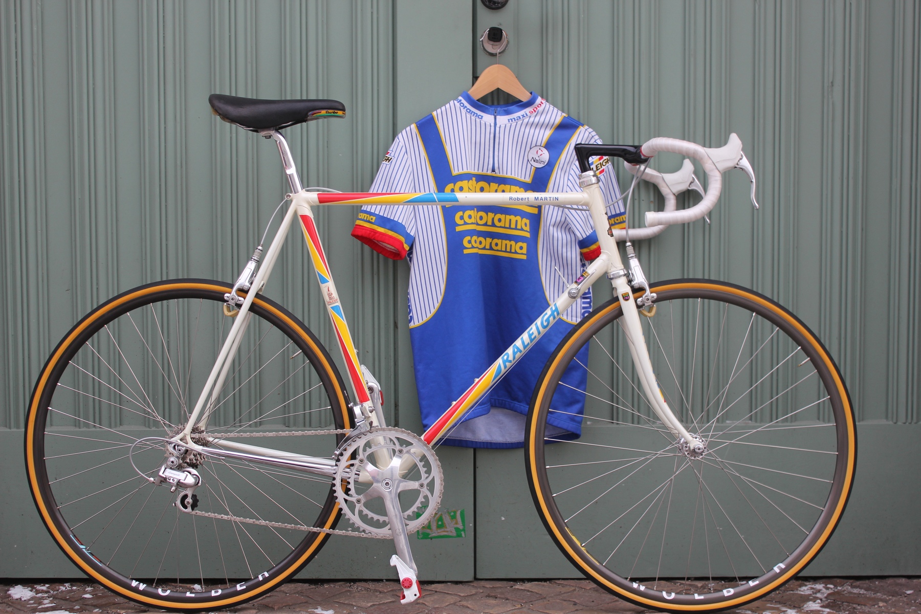 The bike presented here is a small mystery. The frame was built for Robert Martin, yet Robert Martin does not appear in any official team lists from those years. One might think that Robert Martin's name was simply applied as a decal on the top tube—but that is not the case. Both the frame and fork clearly show his initials. The build also features a few peculiarities: the then rather rare C-Record crankset is fitted in 180 mm length, and instead of the standard C-Record shifters, Simplex Retrofriction components were used. The geometry of the frame also suggests a custom-made frame for the team. Anyone with additional information is welcome to contact me.